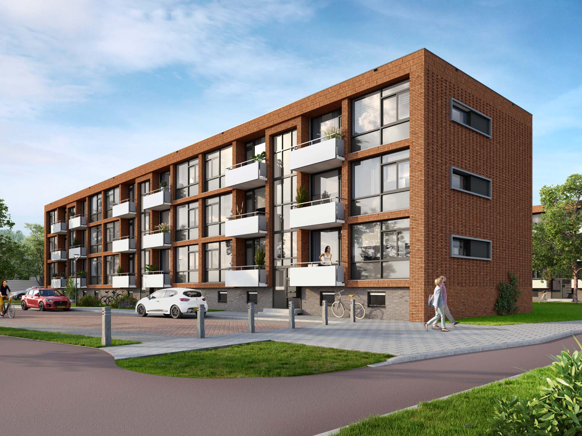 "Architect Beltman uit Enschede maakt in haar ontwerp gebruik van steenstrips in een warme rode kleur en antracietkleurig geëmailleerd glas wat de sociale huurwoningen in combinatie met de witte balkons een moderne uitstraling geeft."
