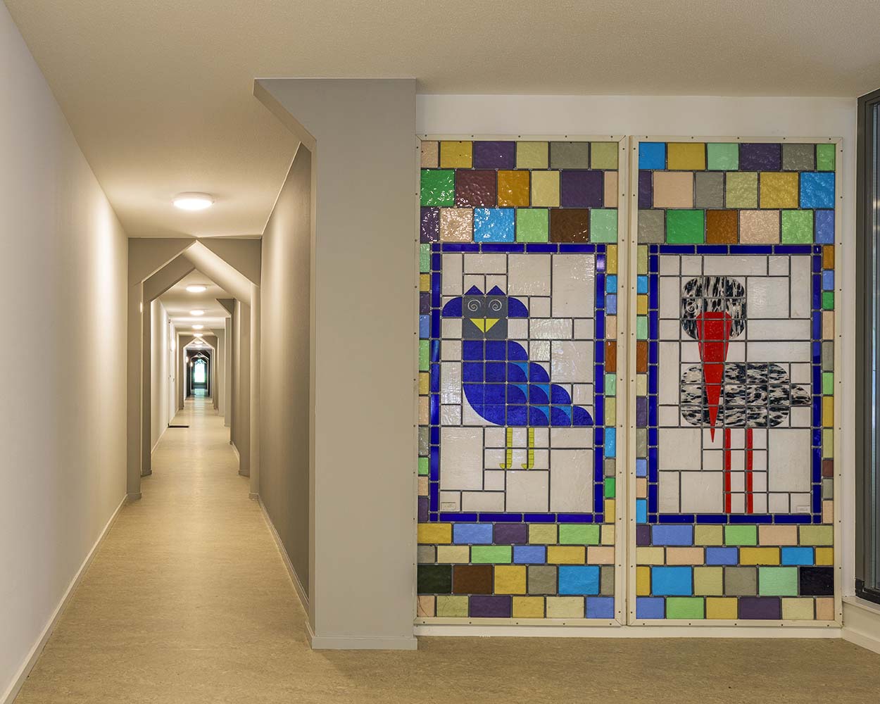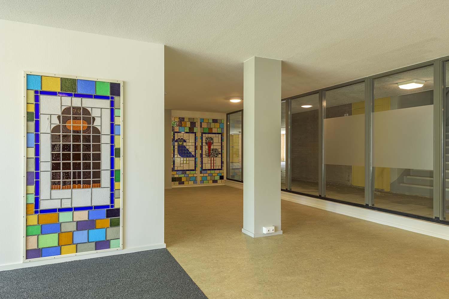 Het groot onderhoud bood tevens de gelegenheid om terug te keren naar de rust en helderheid van het originele ontwerp. De overvloed aan geel is verdwenen en teruggekeerd op de plekken waar het hoort, namelijk in de verticaliteit van de kozijnen. Nu deze kozijnen weer van hout zijn gemaakt, hebben zowel de kozijnen als de panelen daartussen allemaal dezelfde gele tint gekregen.
