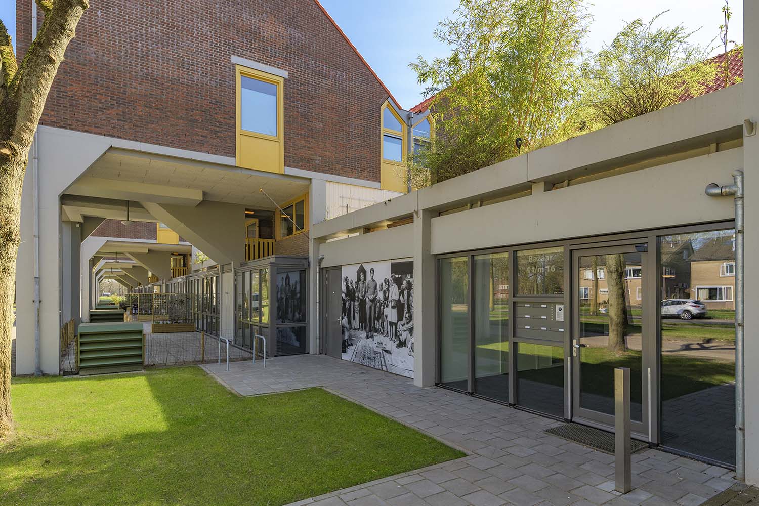 De zeven nieuwe woningen zijn bereikbaar via een binnengang. Deze centrale entree met ruimte voor scootmobielen bevindt zich tussen de bestaande Kasbar en de zeven woningen. De transparante entree geeft vanaf de straat doorzicht naar de Bazaar. De nieuwe voorgevel van de woningen steekt iets verder uit dan de bestaande gevel, om zo voldoende ruimte en daglicht te creëren. De nieuwe gevel is volledig gemaakt van hout, gevuld met glas. De puien krijgen dezelfde donkergrijze kleur als de later toegevoegde elementen. Dankzij de subtiele kleuren en luchtige uitstraling behoudt het krachtige beeld van de opgetilde woning op betonnen pilaren zijn karakter.