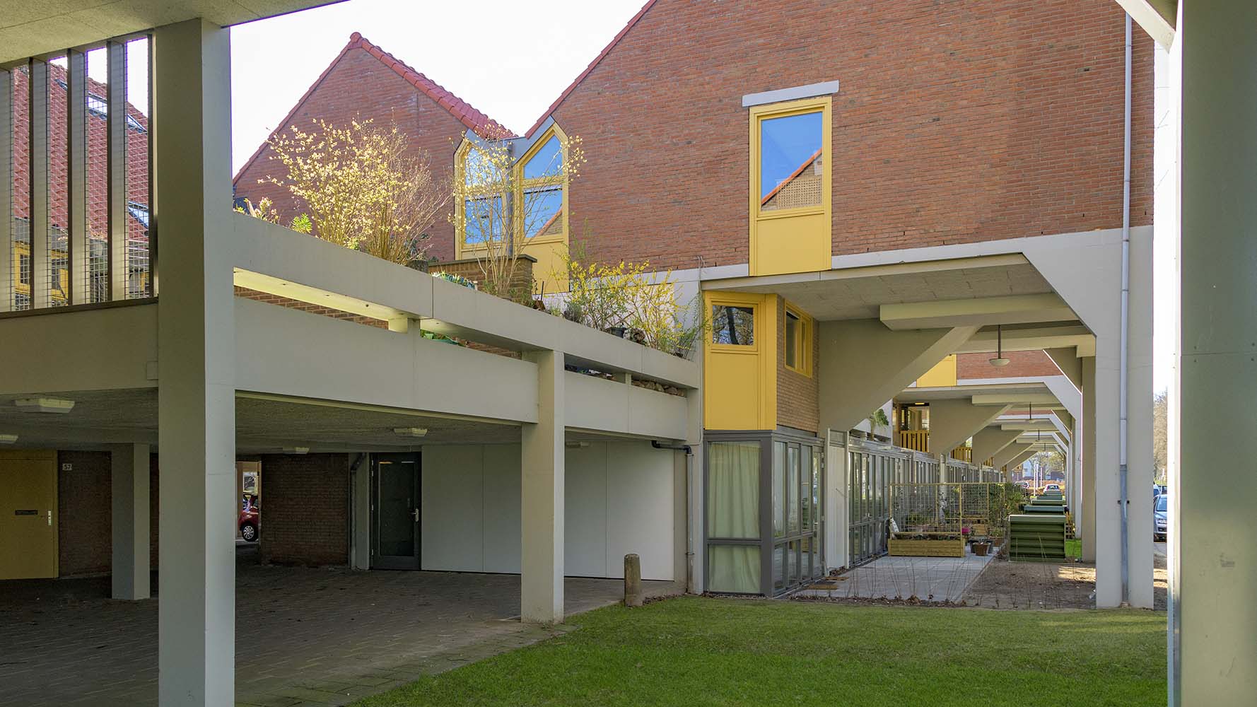 De bestaande betonnen kolommen en balken hebben door de jaren heen verschillende kleuren gehad, met als laatste een lichtgele nuance. Om zo veel mogelijk het oorspronkelijke beeld te benaderen, zijn alle betonnen elementen in een lichte grijstint geschilderd. De goten krijgen dezelfde donkergrijze kleur als de rest van de toevoegingen die door de jaren heen zijn gedaan, zoals bergingsdeuren, schermen bij dakterrassen en tochtdeuren achter het hekwerk.