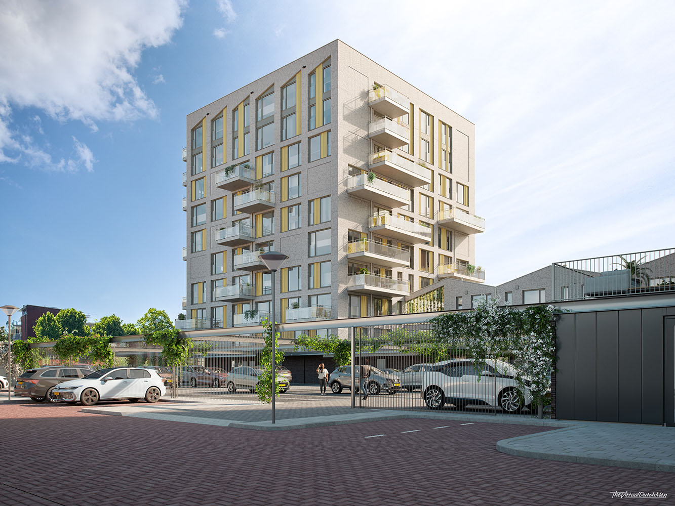 De eerste toren (8 bouwlagen), naast de Wevershal, heeft een warme roodbruine baksteen met groene accenten, aansluitend bij het industriële karakter. De tweede toren (10 bouwlagen), op de punt van het terrein, heeft een lichte grijze baksteen met subtiele ‘koninklijke’ gouden details – een verwijzing naar de Kroon op Indië.