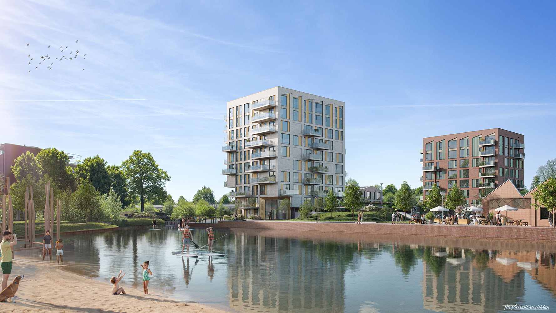 De twee woontorens fungeren als een krachtig ensemble, waarbij materialisering en detaillering zorgen voor een dynamische en gelaagde architectuur. De gevelopbouw met verspringende raamopeningen en geprofileerd staal verwijst subtiel naar de textielindustrie, als een knipoog naar het verleden. Tegelijkertijd realiseren ze een hedendaagse woonkwaliteit, met royale raampartijen die het uitzicht op het water en de stad maximaal benutten.