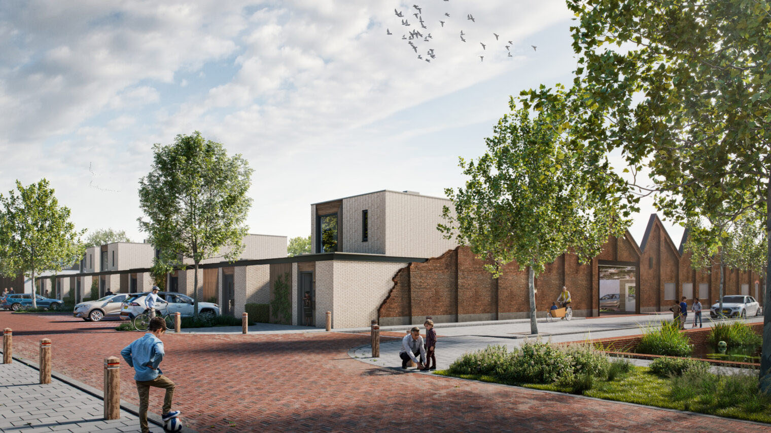De voormalige Wevershal blijft behouden en krijgt een nieuwe functie als parkeer- en verblijfsruimte, waarbij de originele staalconstructie fungeert als pergola en groenstructuur. De bebouwing rondom de Wevershal is gedifferentieerd: