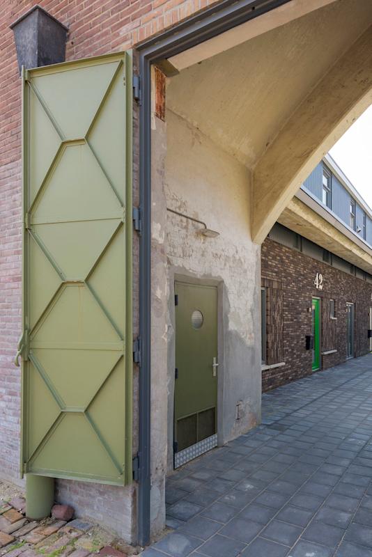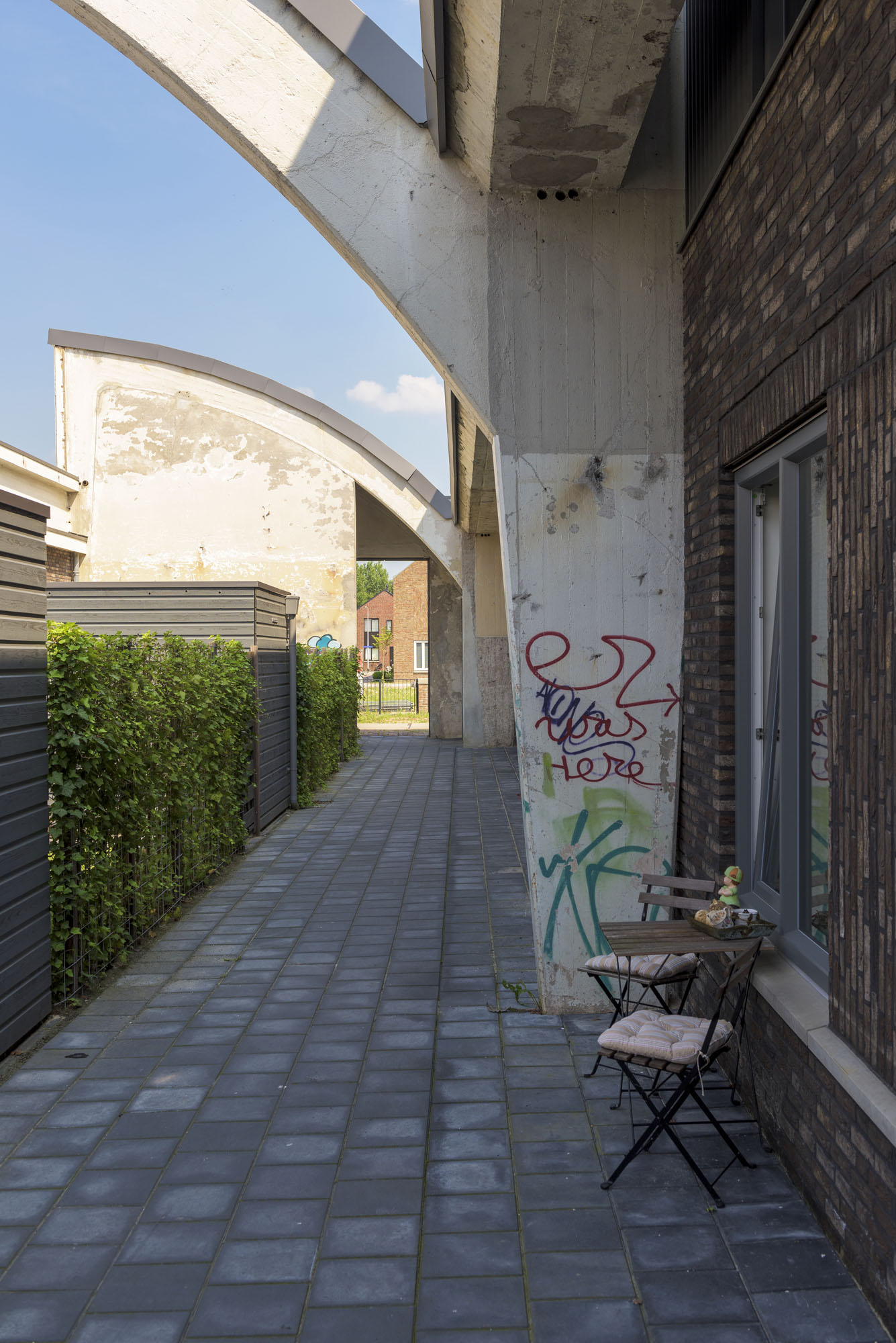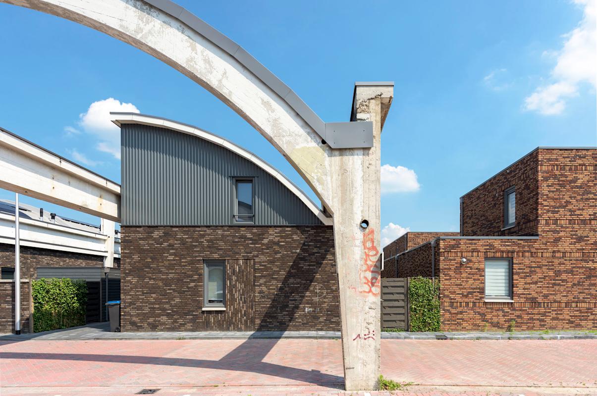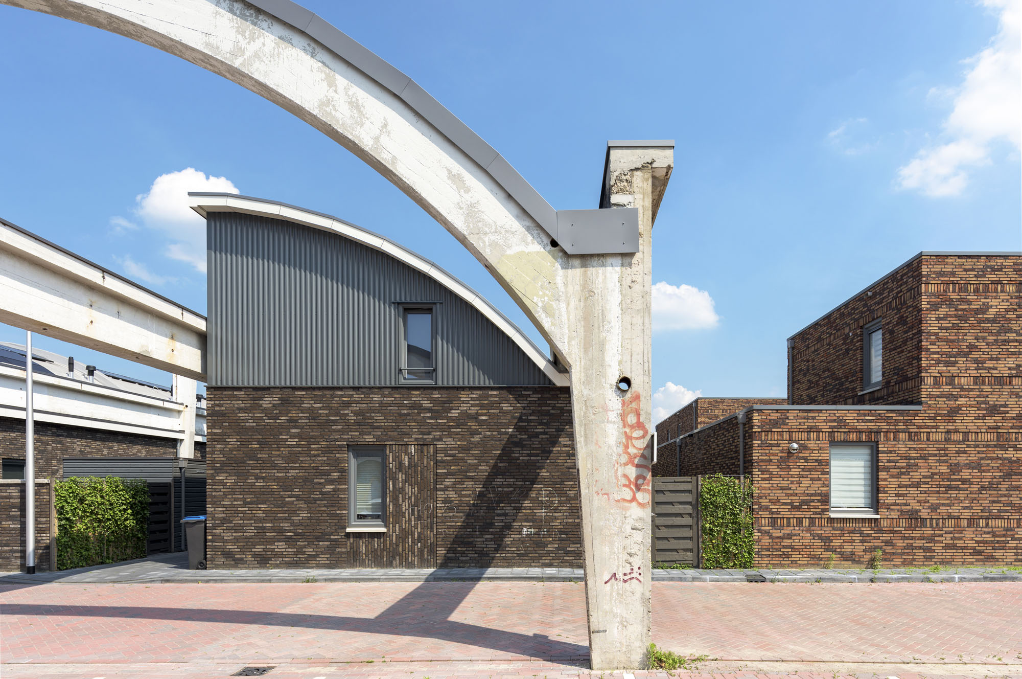 Onder de bestaande betonnen draagstructuur en tussen de spanten zijn woningen ontworpen, met een verwijzing naar het historische industrieel erfgoed. In de vorm van robuust metselwerk, met subtiele metselwerken details en kleurstelling.