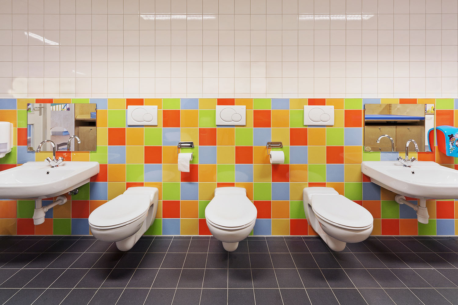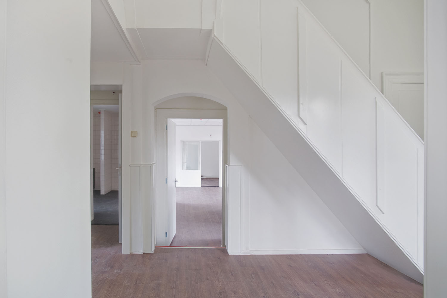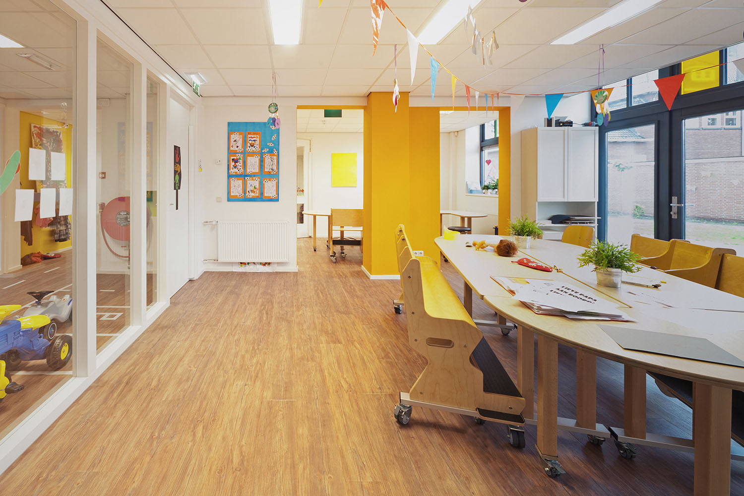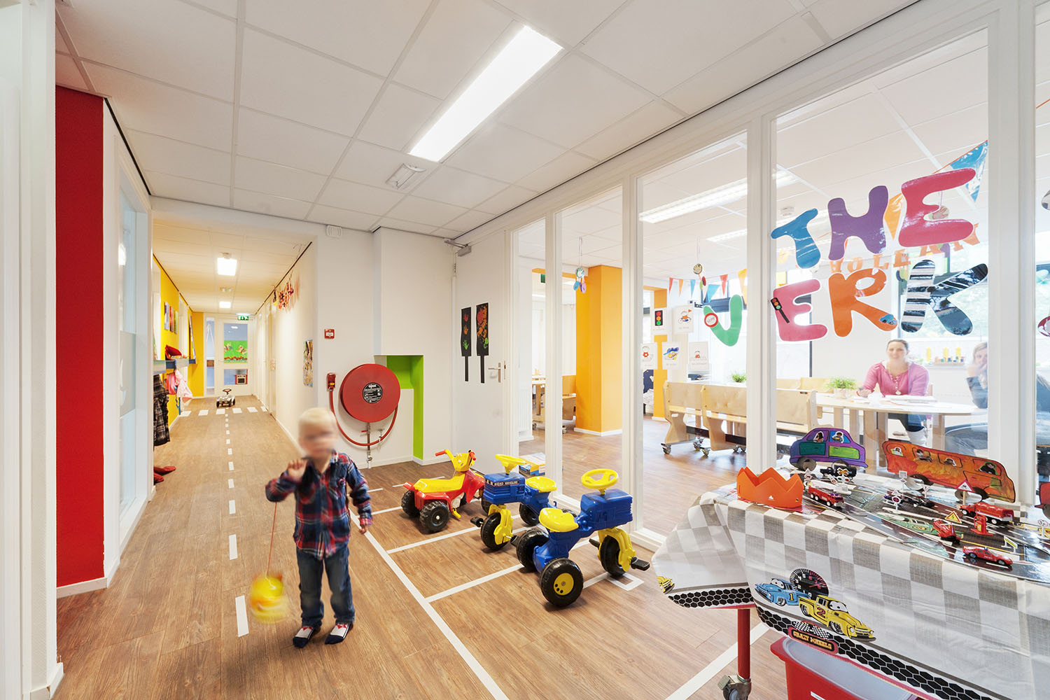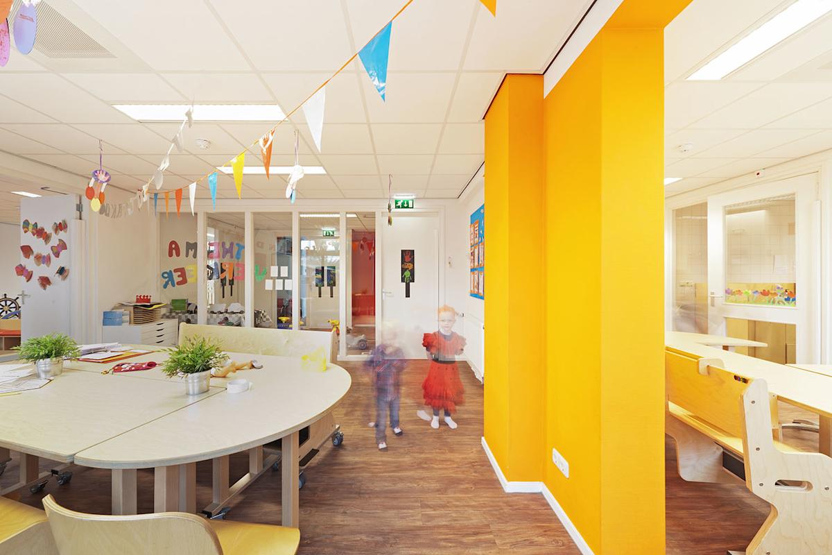 De transparantie die hierdoor ontstaat geeft een ruimtelijker gevoel aan de lange smalle hal. De witte muren versterken dit gevoel. De wanden uitgevoerd in een accentkleur zorgen voor sfeer en uitnodigende ruimtes voor de kinderen.