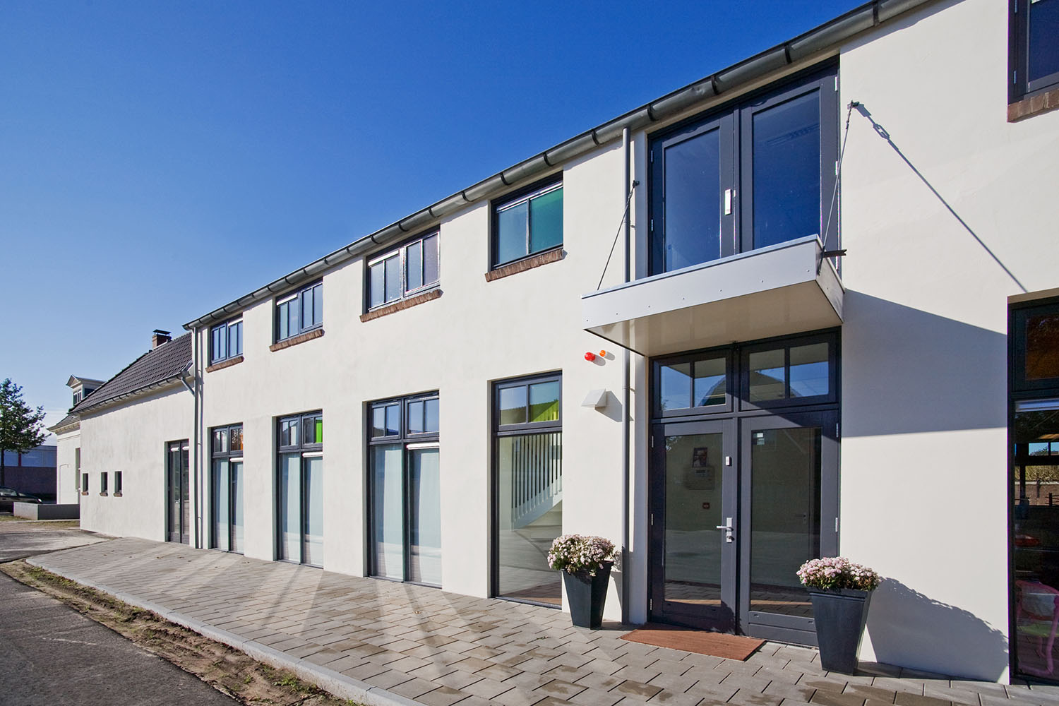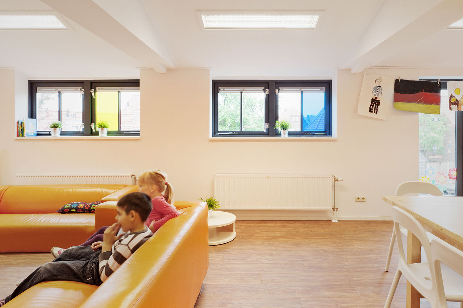 De indeling van de villa is nauwelijks gewijzigd. Zowel de buitenschoolse opvang als het logeerhuis hebben een eigen entree. Het interieur heeft een huiselijke sfeer met rustige kleuren.