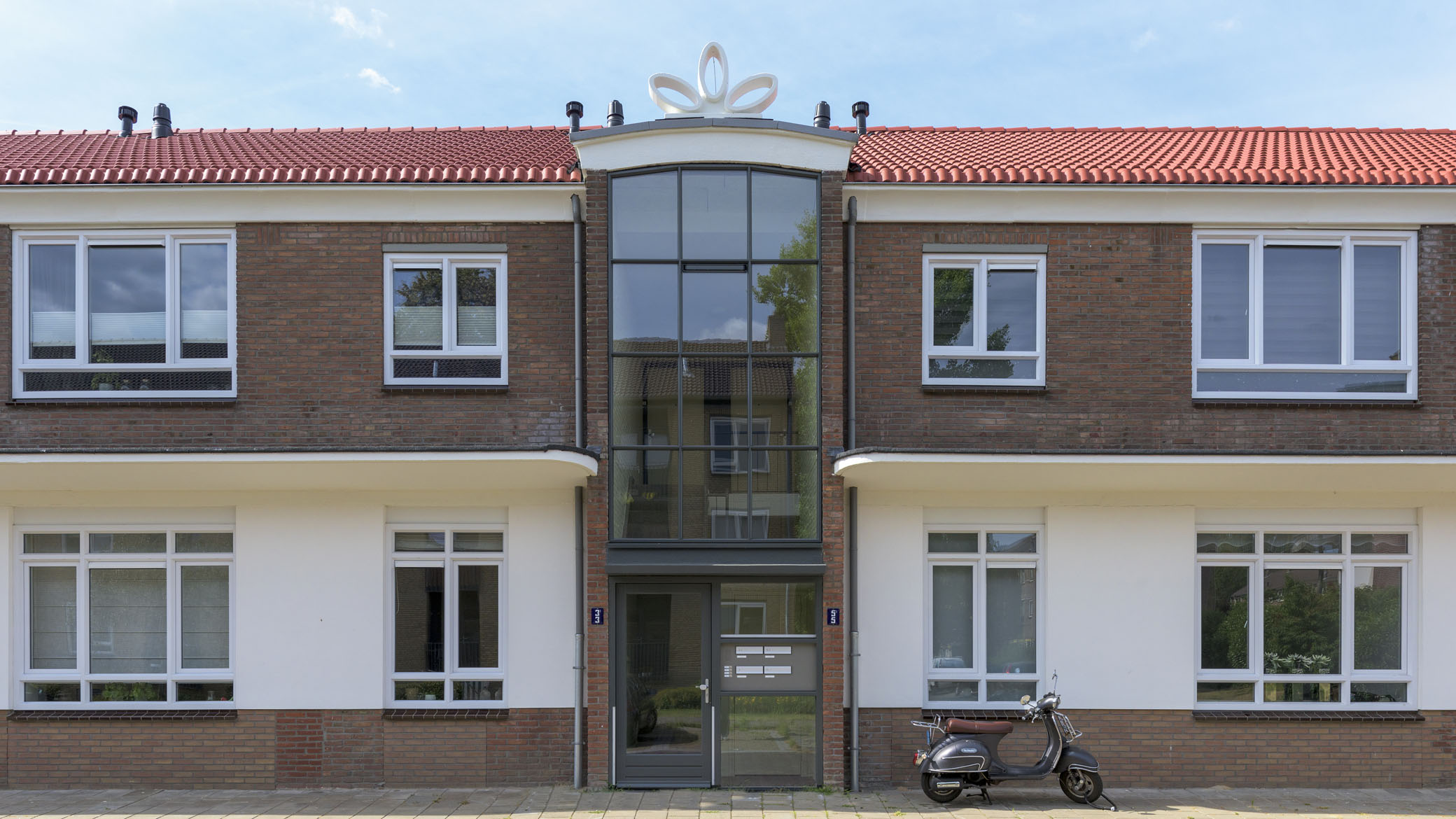 De oorspronkelijke gevels zijn opgeknapt met de originele kleinere betonnen luifels uit de jaren 50.