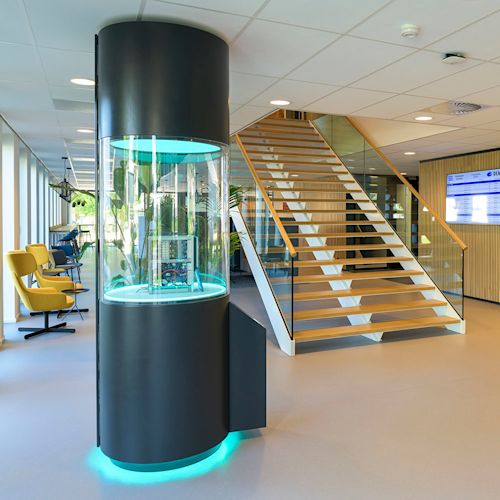 Op het Kennispark Twente ligt de innovatieroute die als verbindend element de omgeving, gebieden en mensen samenbrengt. HQ staat als scharnierpunt op deze route. Om die reden hebben we HQ hét landmark gemaakt, als duidelijk herkenningspunt op de campus. Ontmoeting en verbinding is letterlijk zichtbaar.