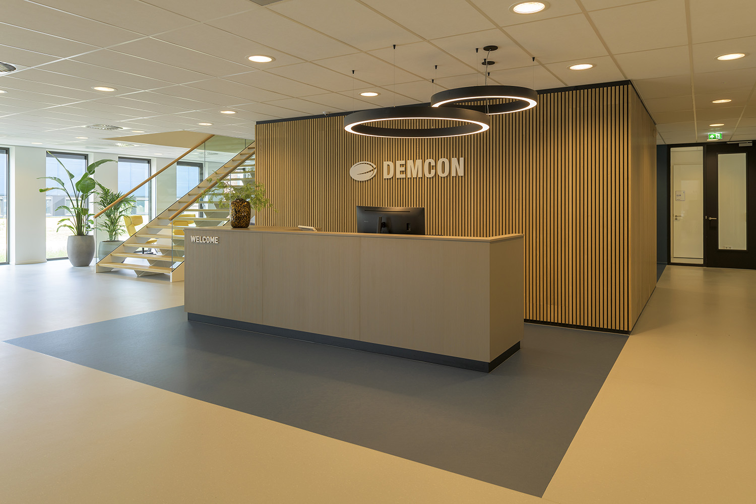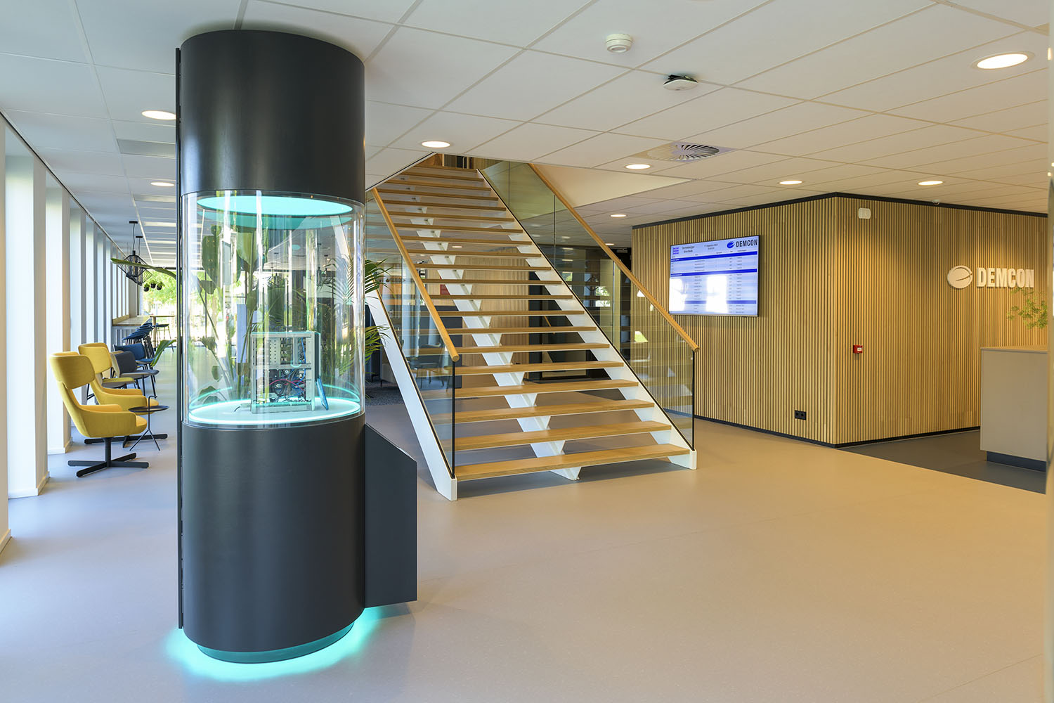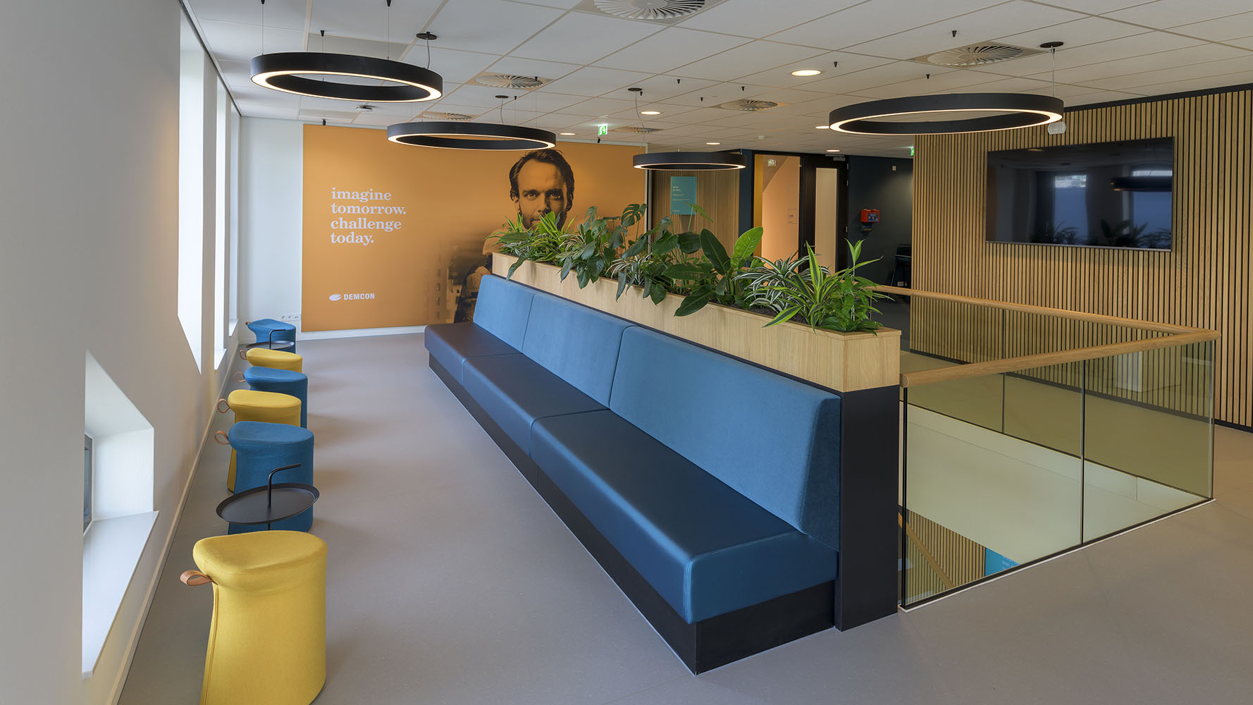Alle vaste inrichting is als maatwerk ontworpen met een verfijnde en strakke detaillering. Het interieur heeft een rustige uitstraling met een vriendelijk kleurenpallet van blauw, beige en zwart. Op verschillende plekken zijn visuals en accenten toegevoegd in blauw en geel. Het ‘Demcon-gevoel’ komt hiermee tot uiting in een uitgebalanceerd en vriendelijk interieurontwerp.