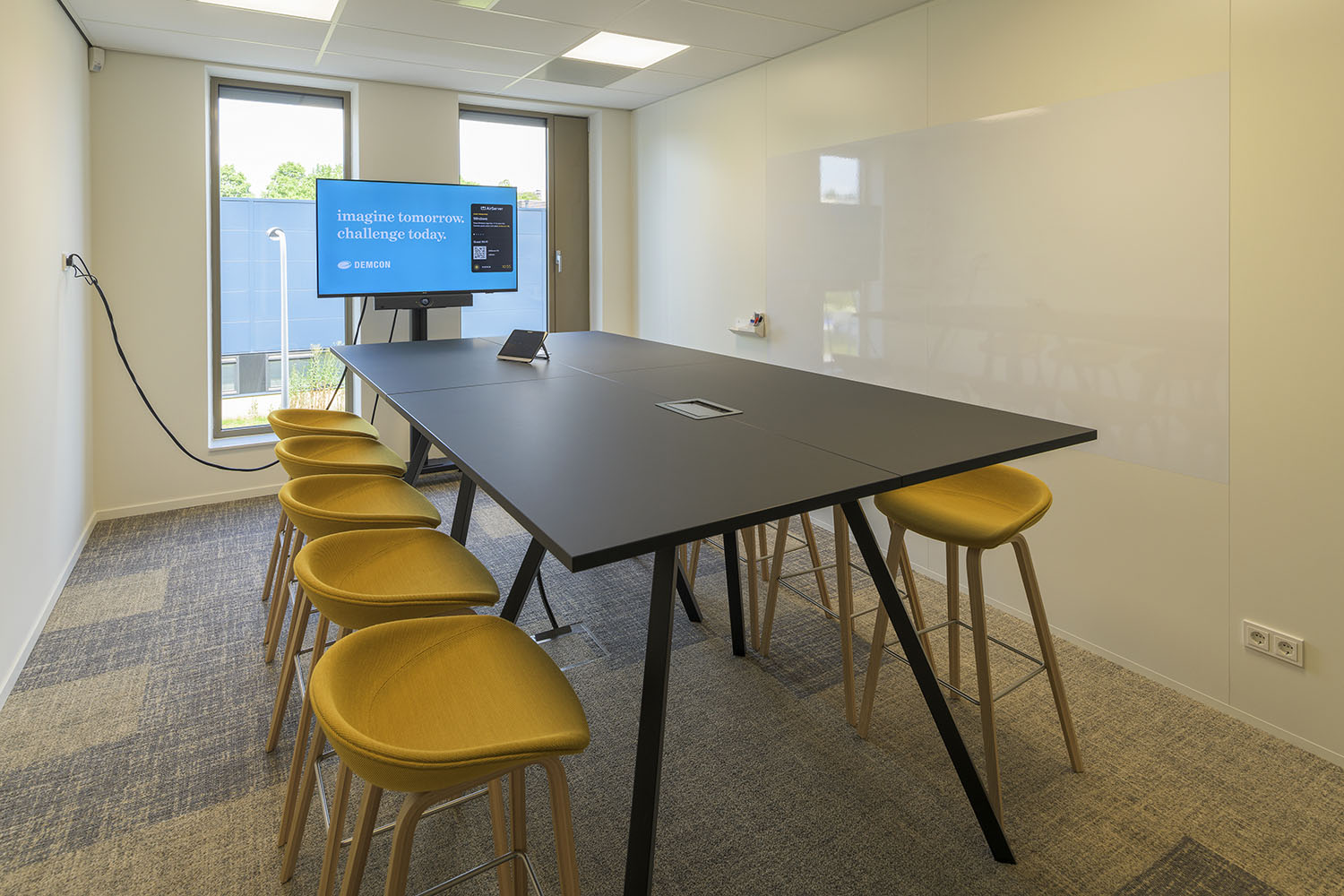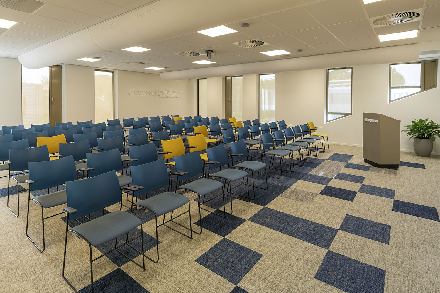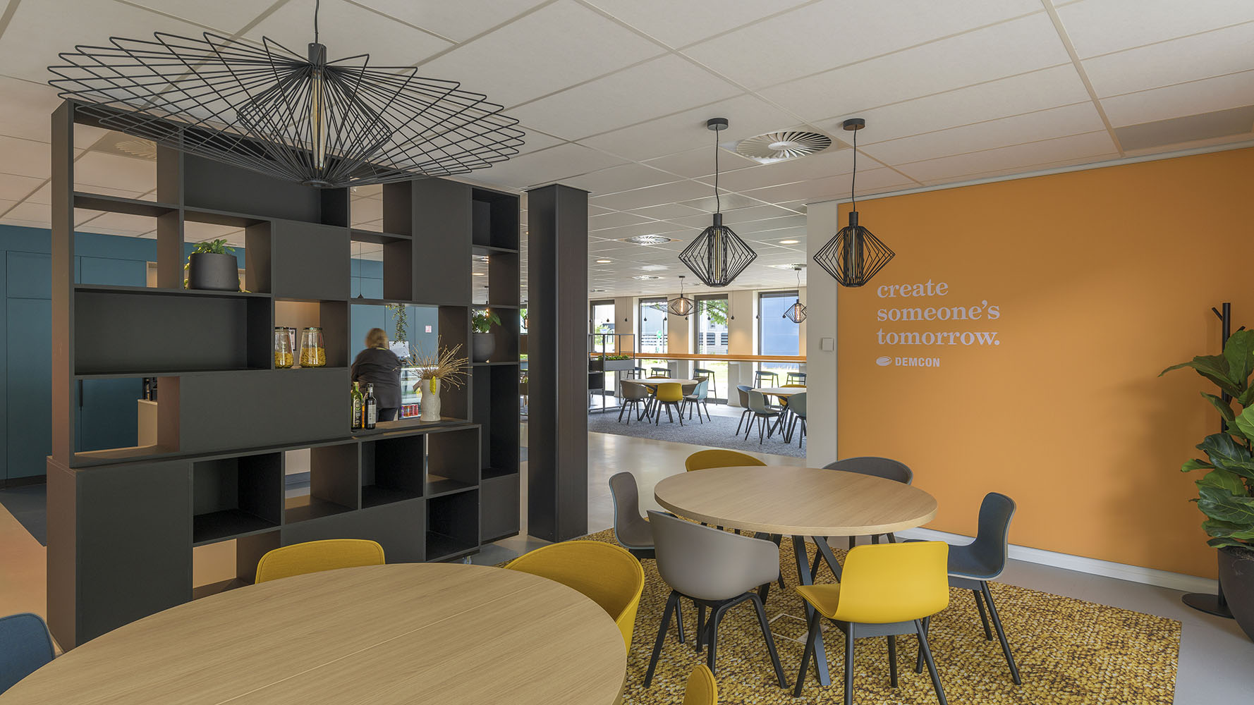 Alle vaste inrichting is als maatwerk ontworpen met een verfijnde en strakke detaillering. Het interieur heeft een rustige uitstraling met een vriendelijk kleurenpallet van blauw, beige en zwart. Op verschillende plekken zijn visuals en accenten toegevoegd in blauw en geel. Het ‘Demcon-gevoel’ komt hiermee tot uiting in een uitgebalanceerd en vriendelijk interieurontwerp.