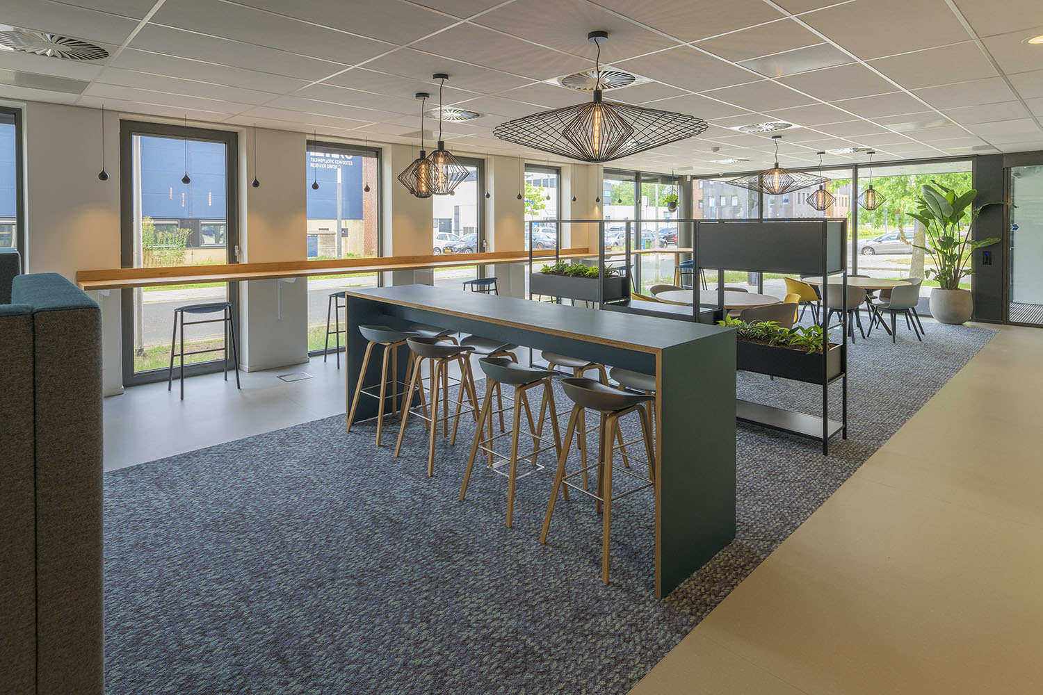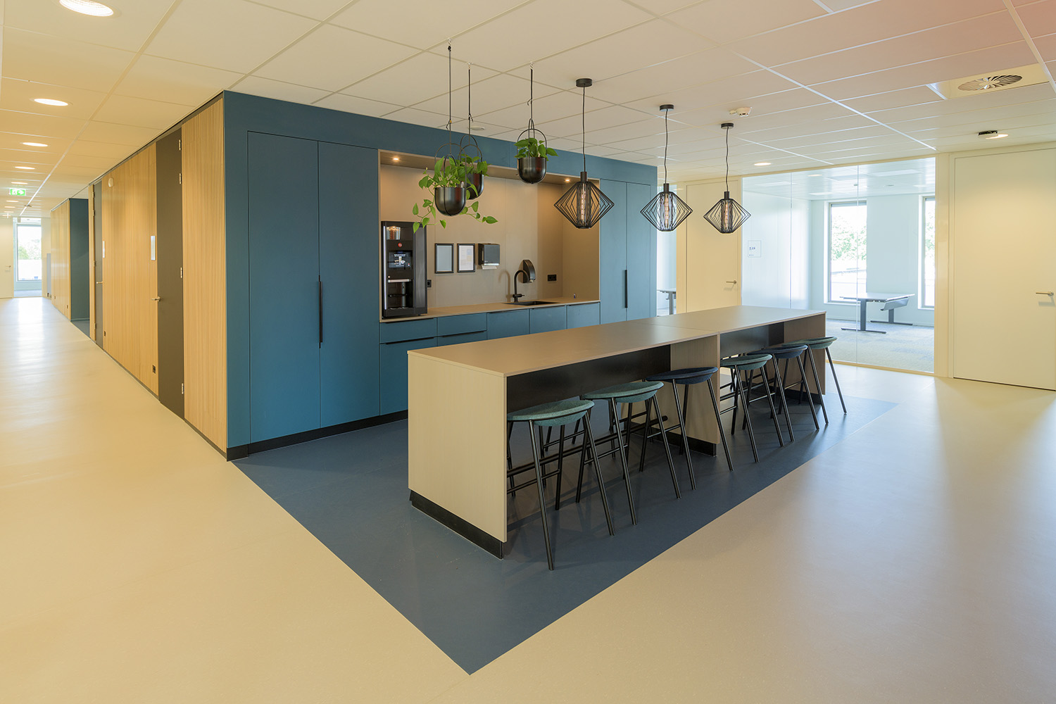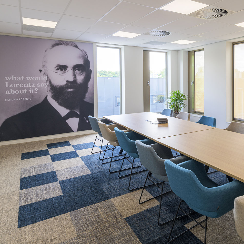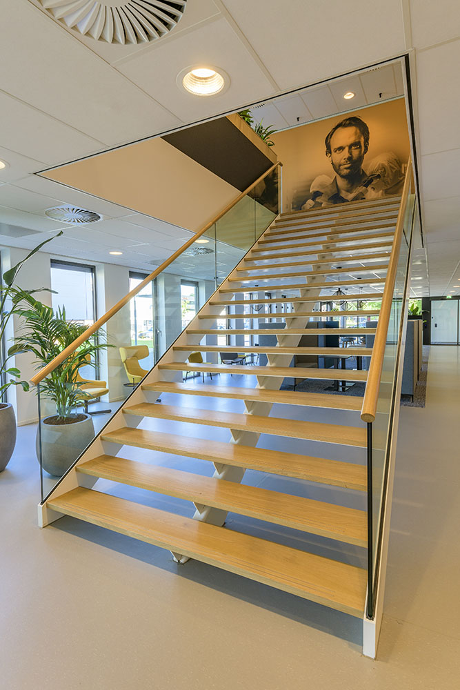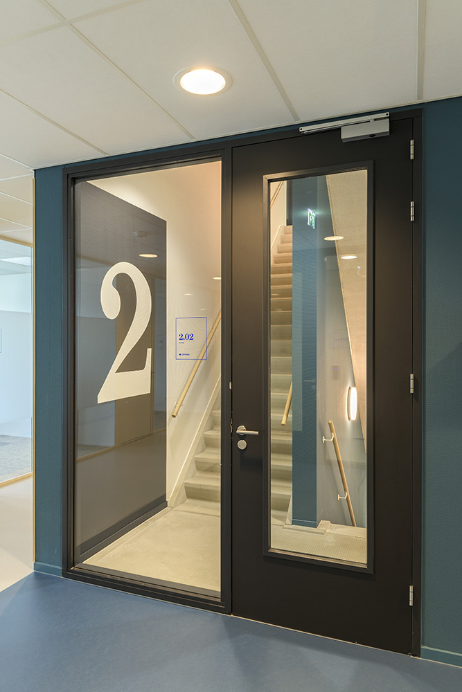 Op de begane grond zorgt een open en transparante ontvangst- en ontmoetingsruimte met koffiebar voor verbinding tussen medewerkers, bezoekers en andere gasten. Een royale trap bij de hoofdentree geeft toegang tot vergader- en presentatieruimtes op de eerste verdieping. De overige bouwlagen zijn ingevuld met diverse kantoorruimtes en vergaderruimtes, die om een centrale kern liggen. Deze centrale kern met trappen, lift, sanitaire ruimte en koffiebar is vormgegeven als één functionele zone. En is herkenbaar aan de donkerblauwe vloer, tussenwanden en maatwerk kastenwanden. De kern heeft een akoestische afwerking met eiken latten, die sfeer en warmte geeft aan het interieur en zichtbaar is vanuit alle kantoorruimtes.