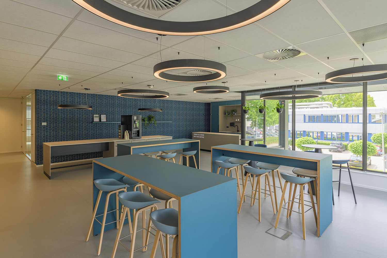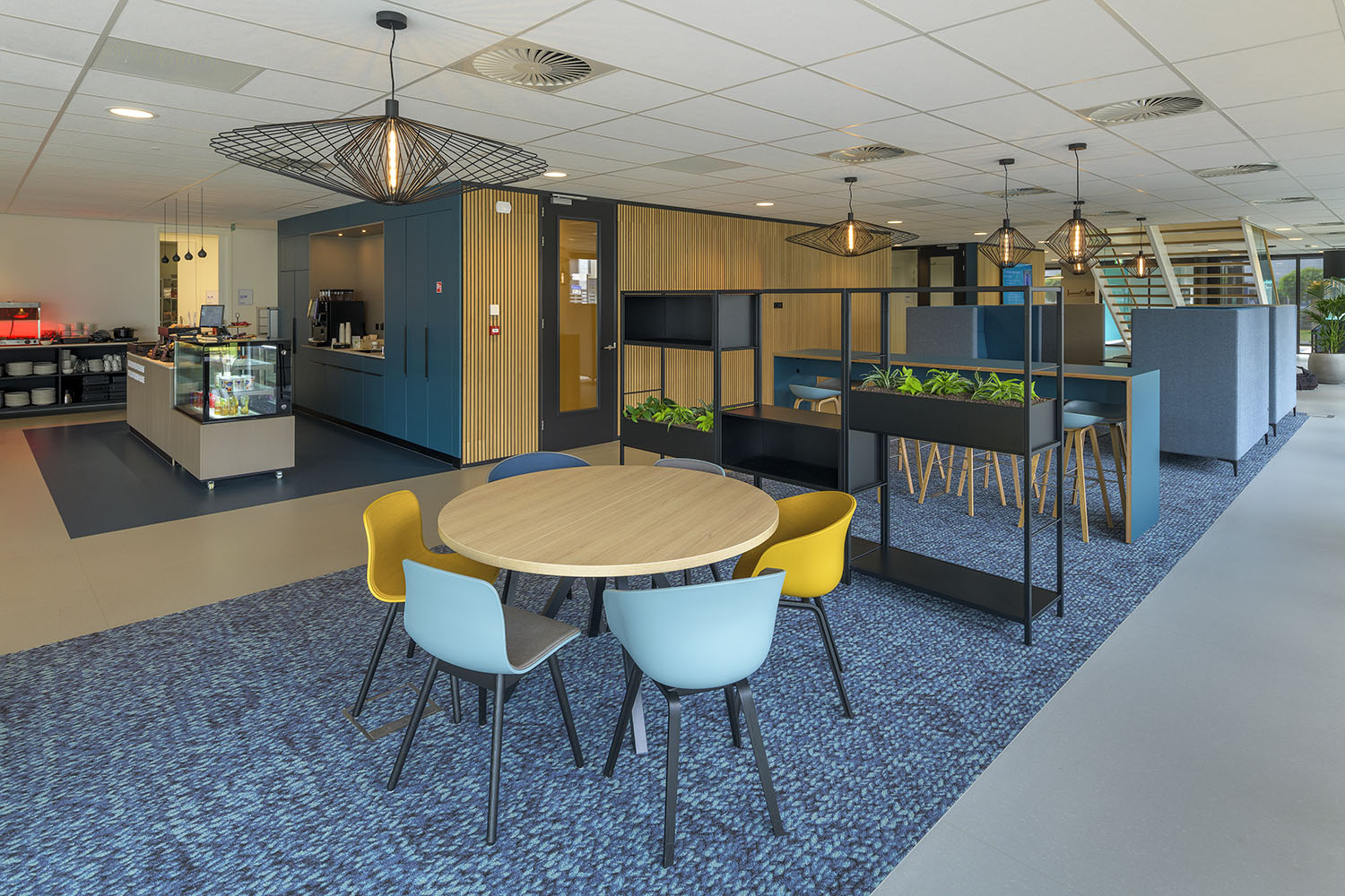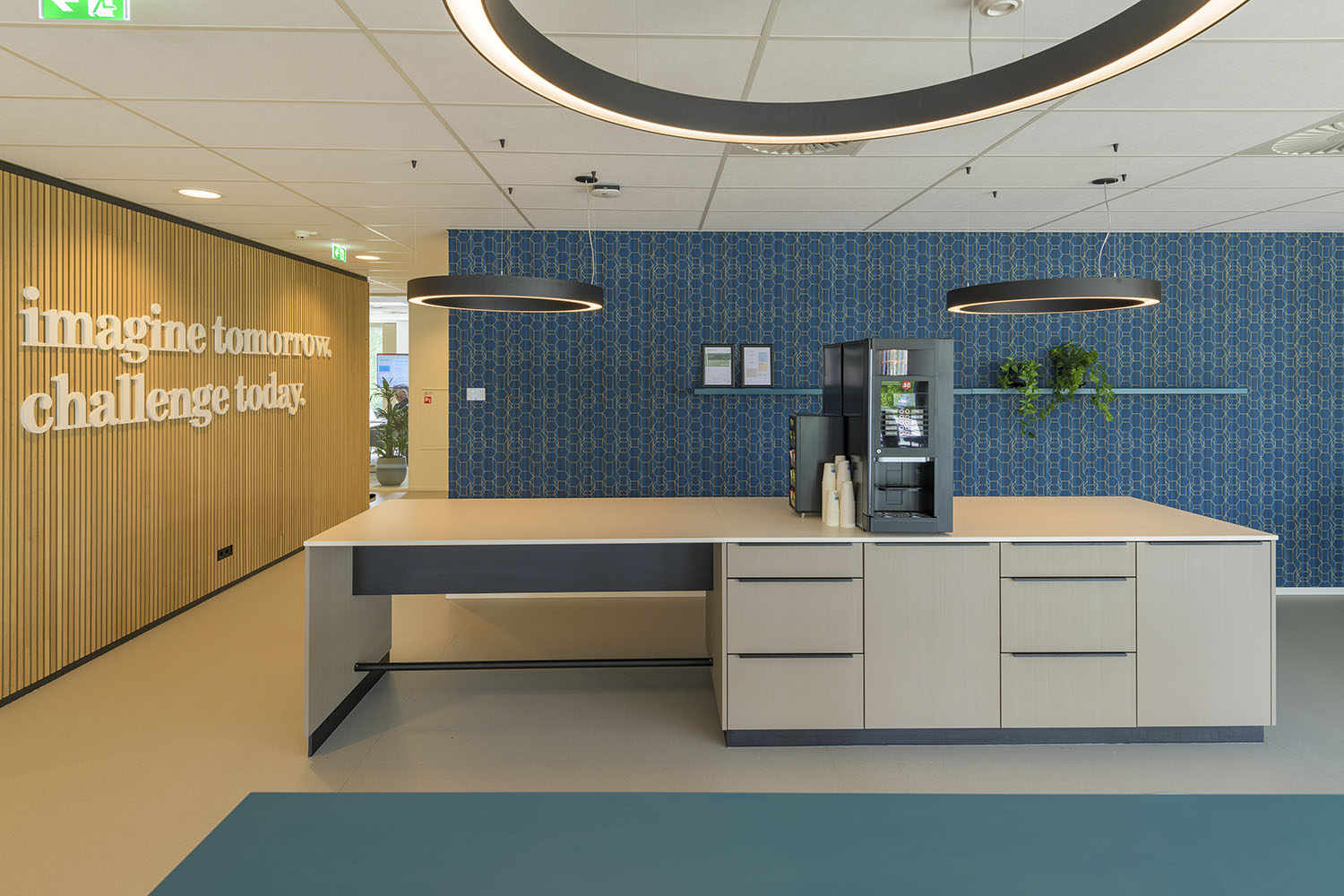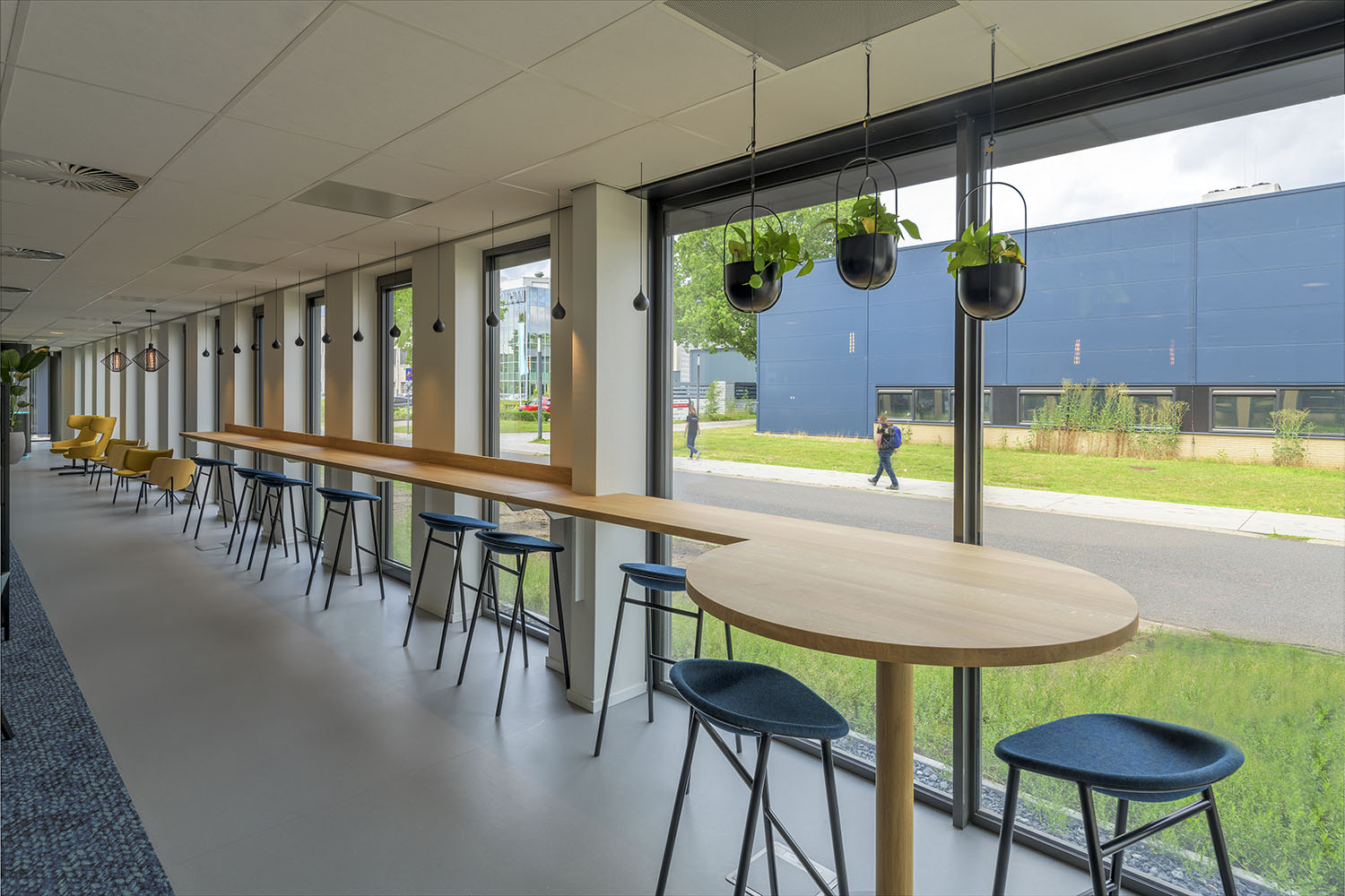 Op de begane grond zorgt een open en transparante ontvangst- en ontmoetingsruimte met koffiebar voor verbinding tussen medewerkers, bezoekers en andere gasten. Een royale trap bij de hoofdentree geeft toegang tot vergader- en presentatieruimtes op de eerste verdieping. De overige bouwlagen zijn ingevuld met diverse kantoorruimtes en vergaderruimtes, die om een centrale kern liggen. Deze centrale kern met trappen, lift, sanitaire ruimte en koffiebar is vormgegeven als één functionele zone. En is herkenbaar aan de donkerblauwe vloer, tussenwanden en maatwerk kastenwanden. De kern heeft een akoestische afwerking met eiken latten, die sfeer en warmte geeft aan het interieur en zichtbaar is vanuit alle kantoorruimtes.