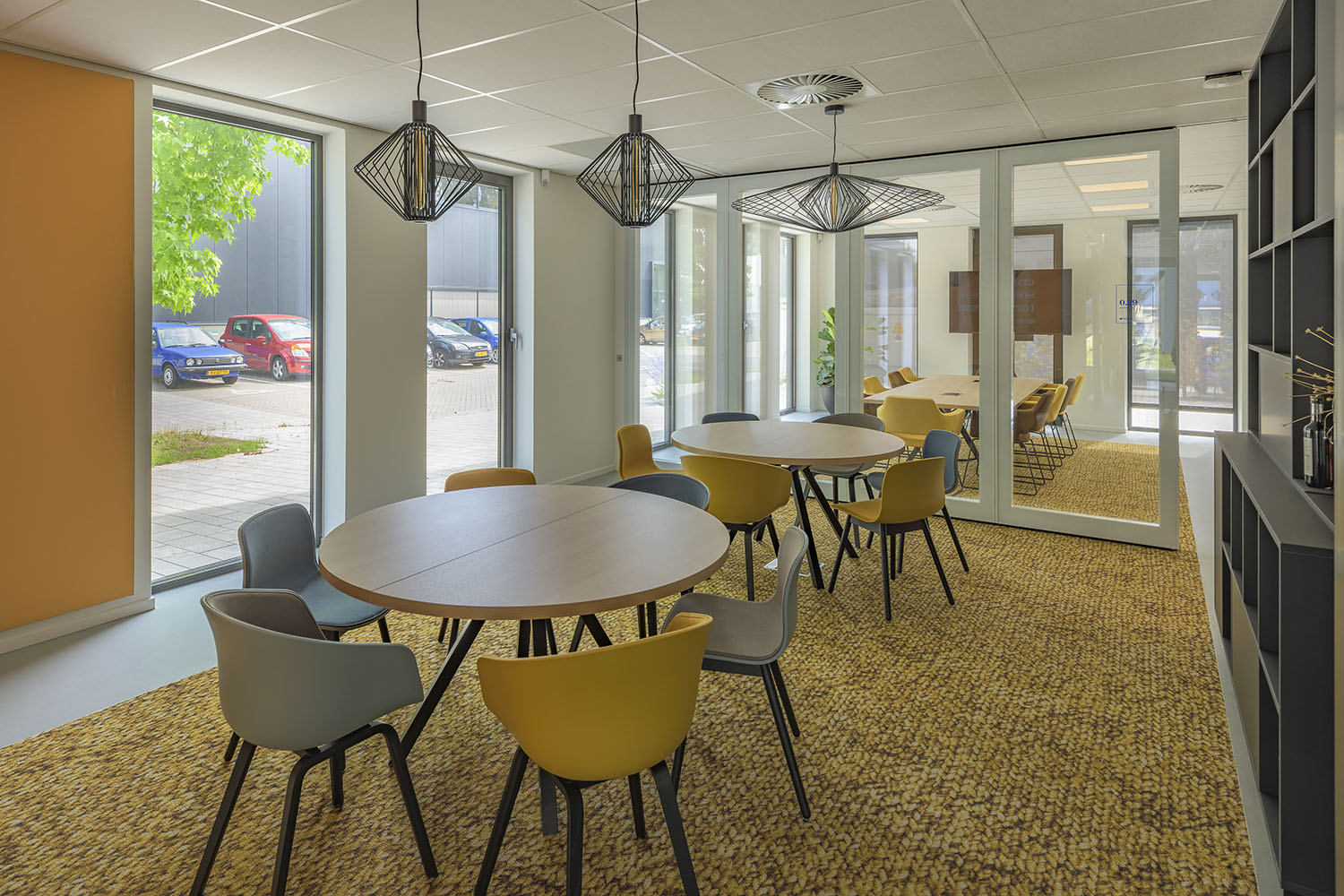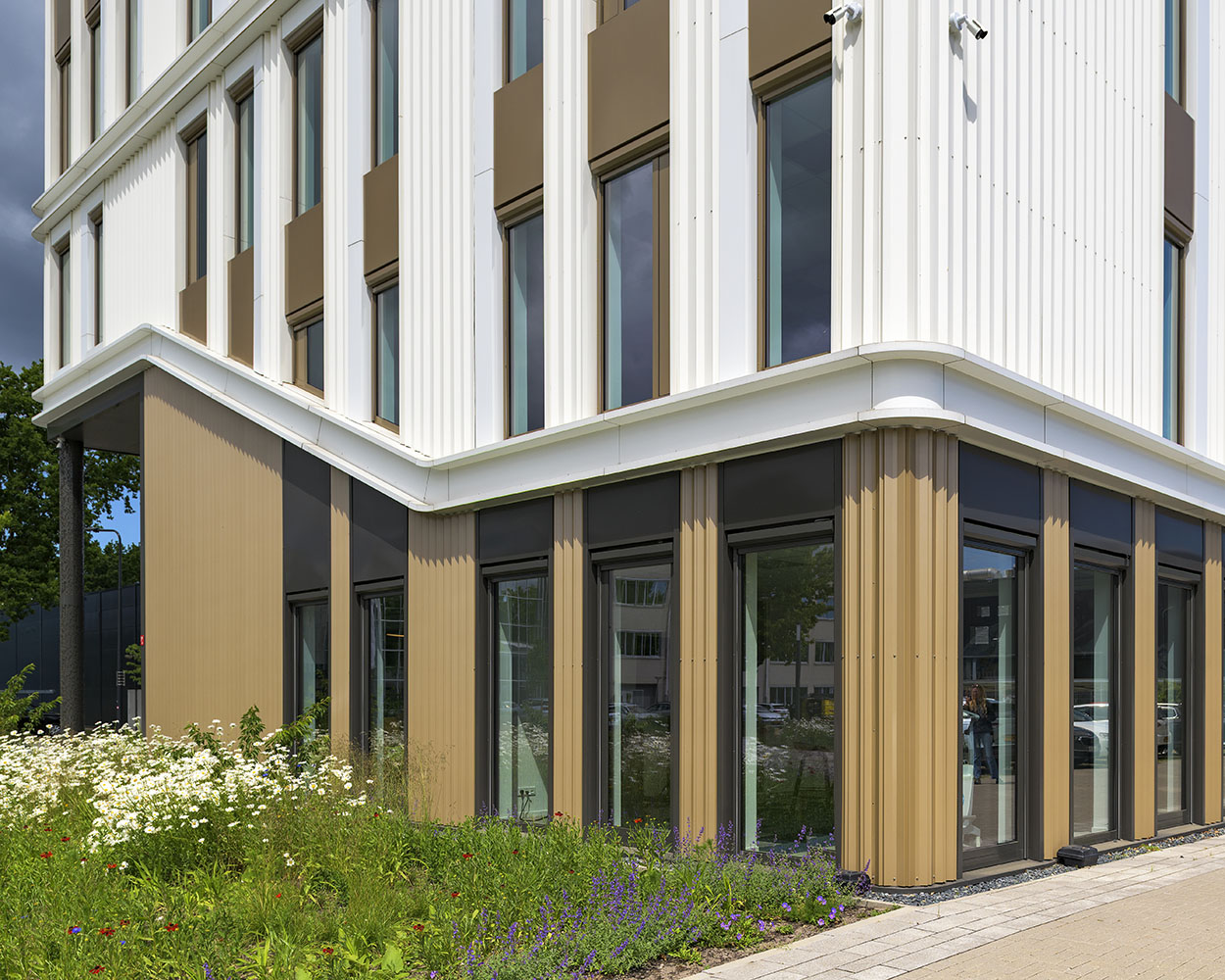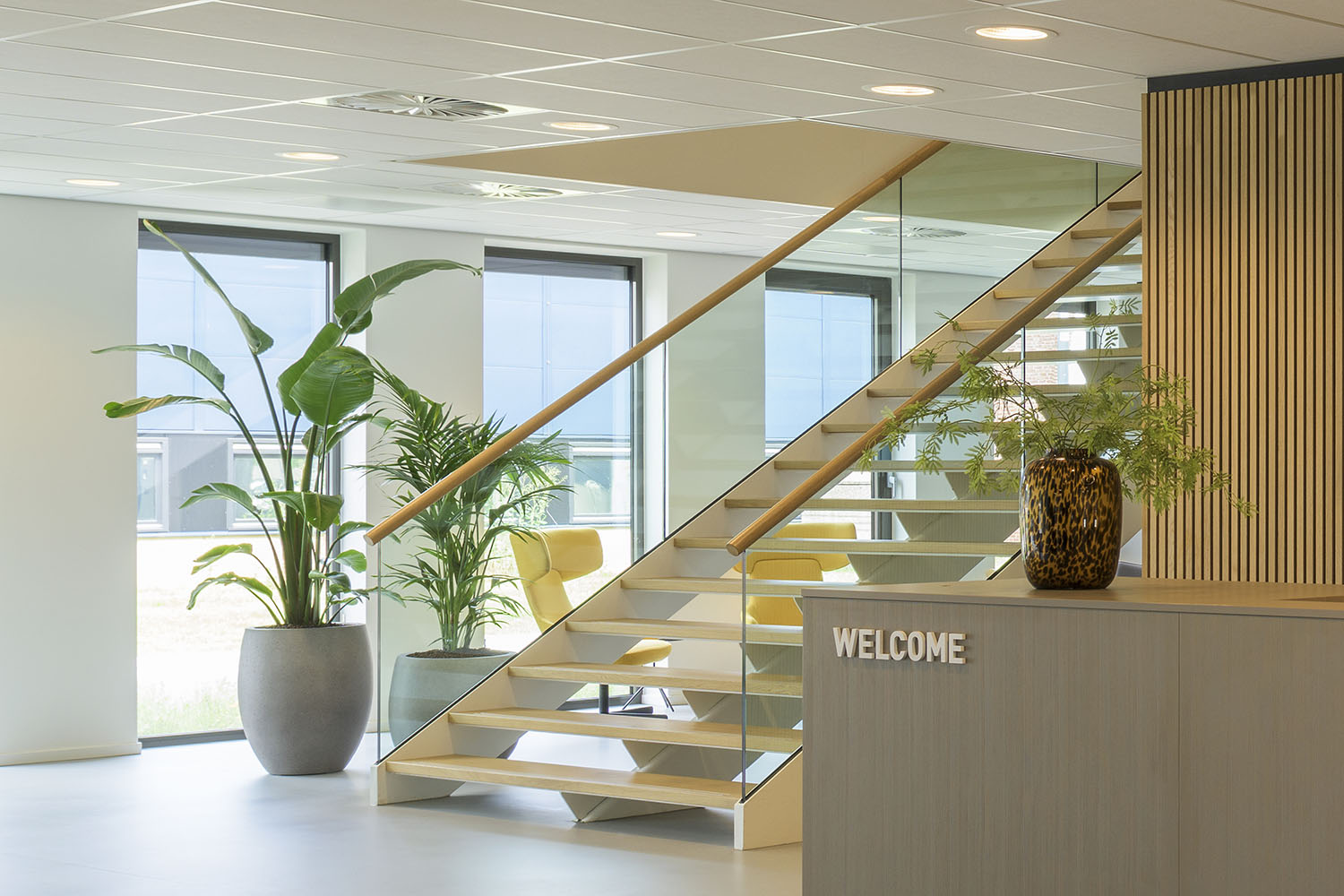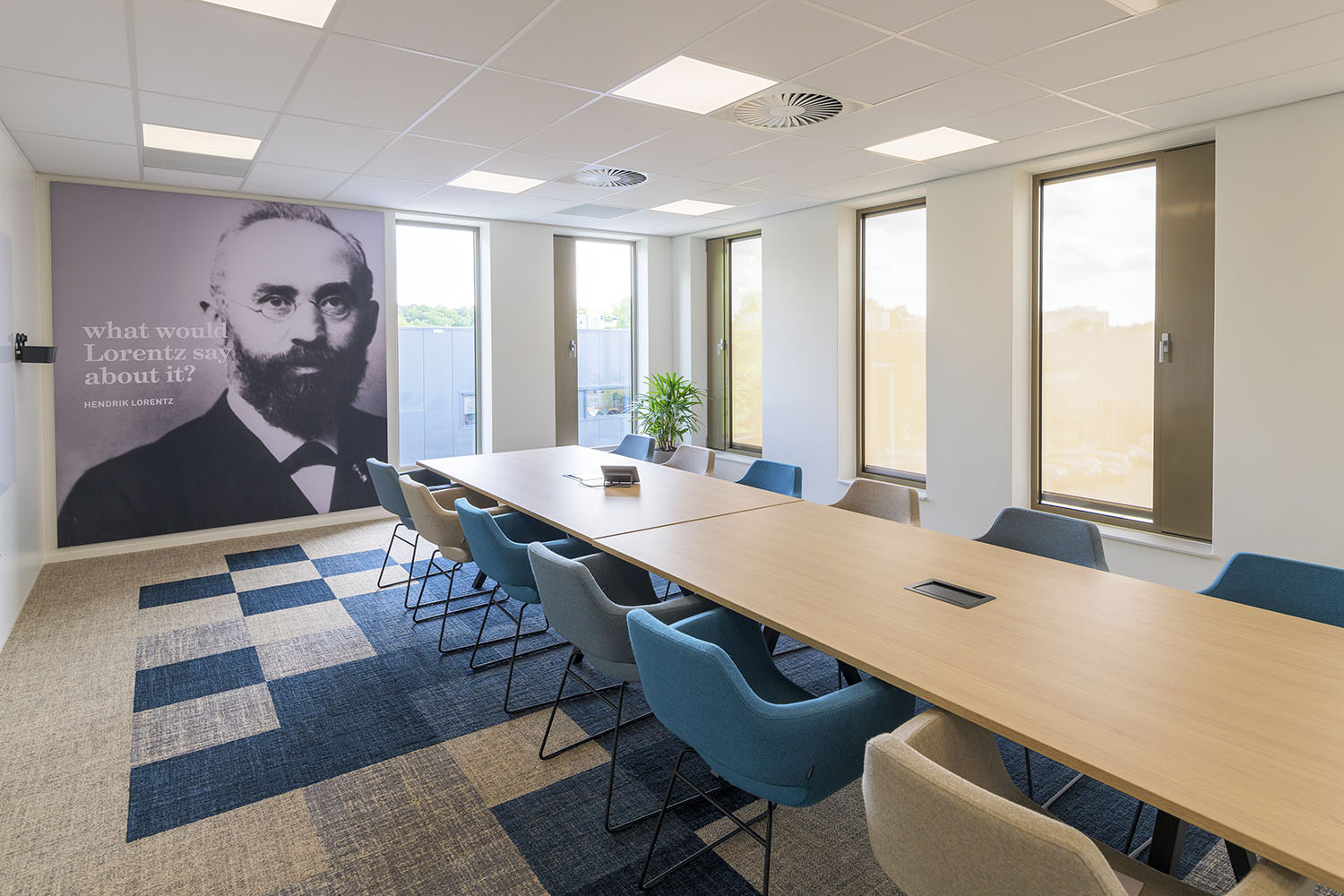 Op de begane grond zorgt een open en transparante ontvangst- en ontmoetingsruimte met koffiebar voor verbinding tussen medewerkers, bezoekers en andere gasten. Een royale trap bij de hoofdentree geeft toegang tot vergader- en presentatieruimtes op de eerste verdieping. De overige bouwlagen zijn ingevuld met diverse kantoorruimtes en vergaderruimtes, die om een centrale kern liggen. Deze centrale kern met trappen, lift, sanitaire ruimte en koffiebar is vormgegeven als één functionele zone. En is herkenbaar aan de donkerblauwe vloer, tussenwanden en maatwerk kastenwanden. De kern heeft een akoestische afwerking met eiken latten, die sfeer en warmte geeft aan het interieur en zichtbaar is vanuit alle kantoorruimtes.