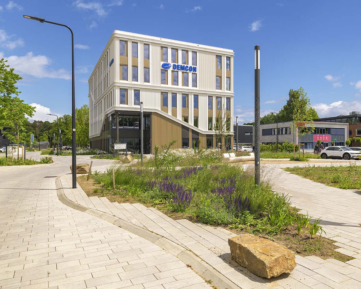 Groei en ontwikkeling staat centraal met de Twentse nuchterheid in het achterhoofd. De eenvoud van het HQ past hierbij en straalt kracht uit. Wanneer je een stap dichterbij zet, verrast de verfijning en aandacht voor detail. Het spel van de bewegingen in de gevel, de plint in relatie tot het ontmoetingsplein en de verticale raamstroken maken het HQ het meest bijzonder. Het laat de vernieuwing, de groei en de speelsheid zien van Demcon. Van geen enkele kant is het gebouw hetzelfde, er gebeurt telkens wat anders en trekt je ogen ernaartoe.