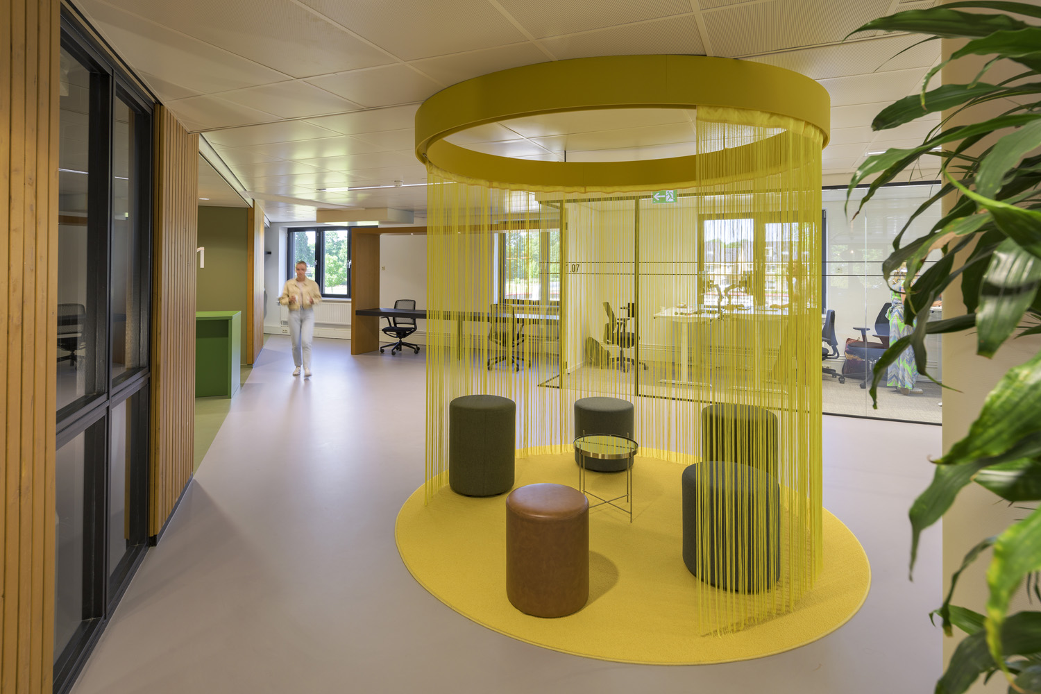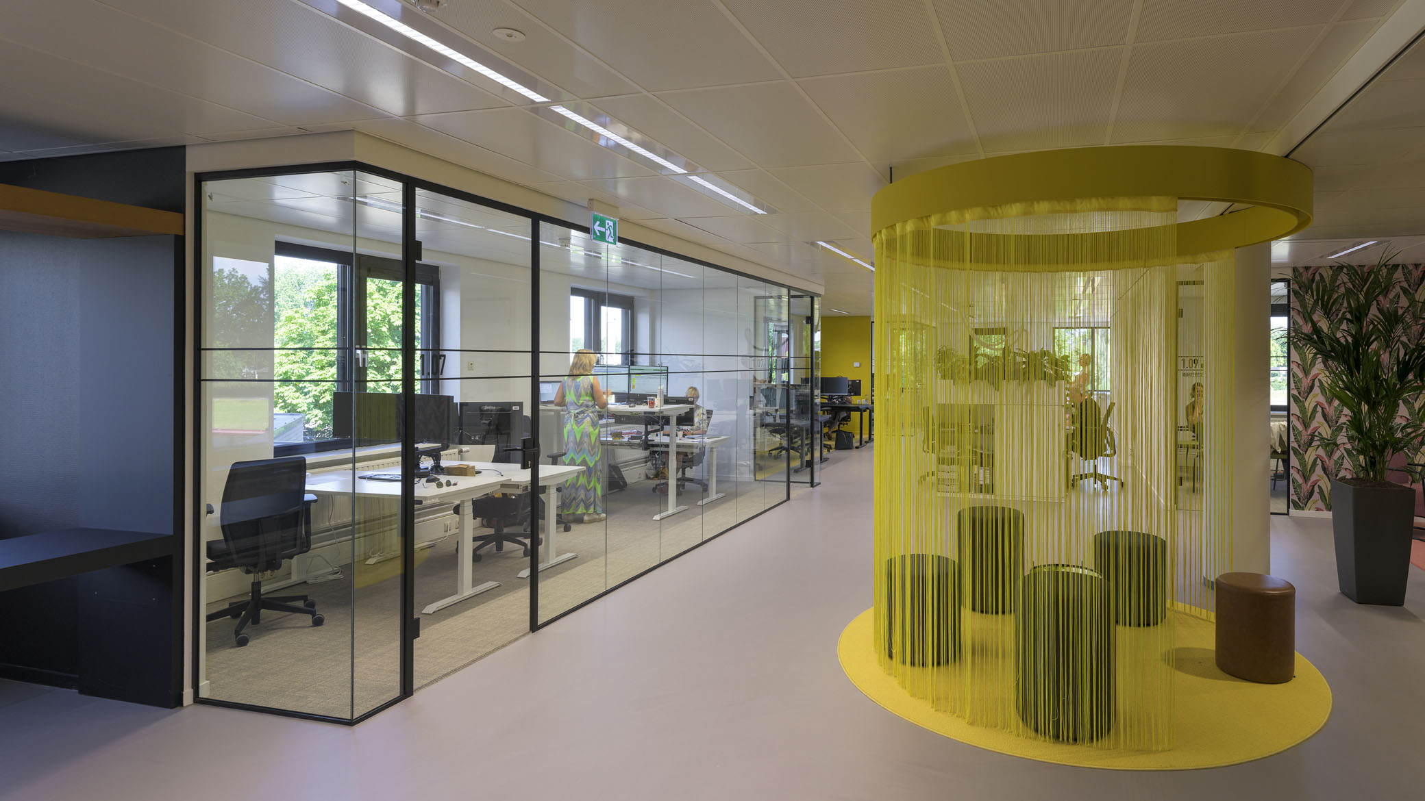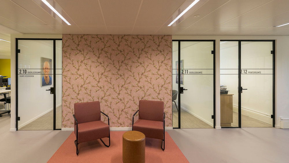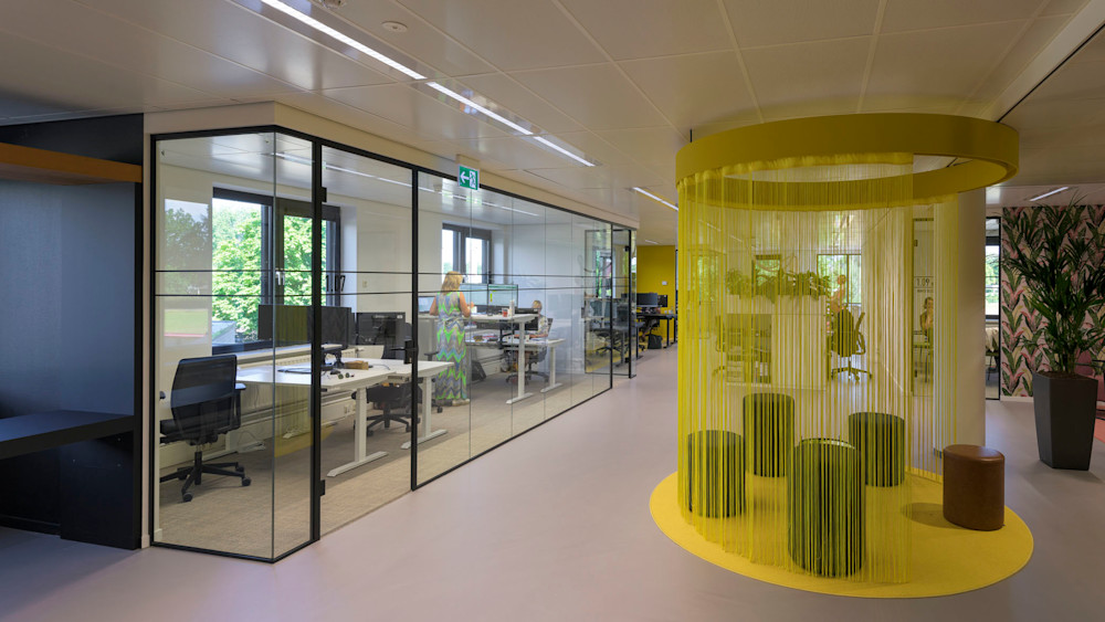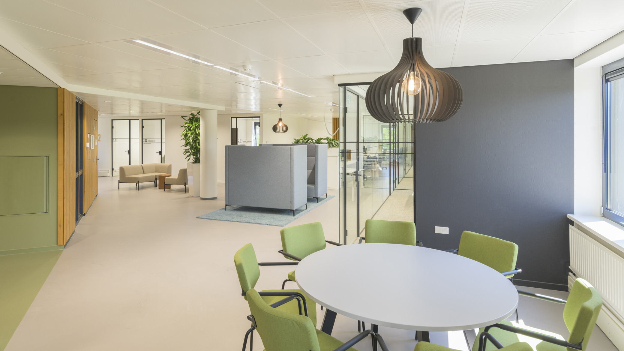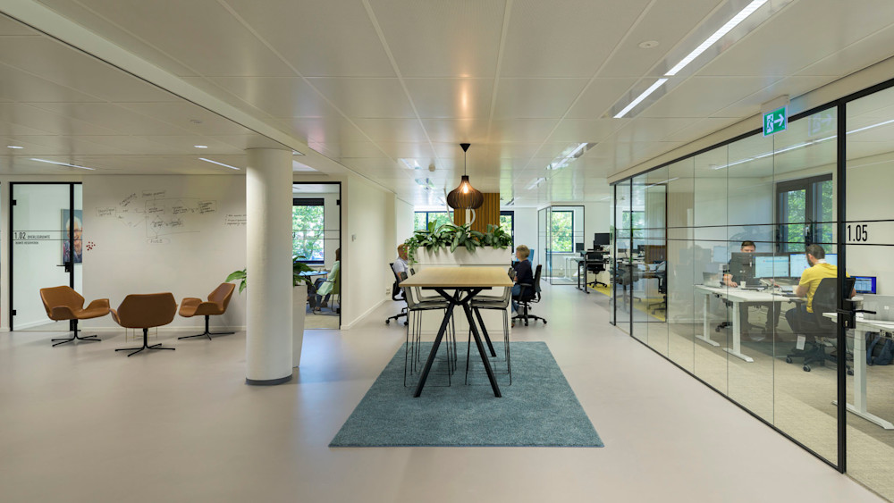 Met als uitgangspunt flexibele werkplekken voor iedereen hebben wij een open dynamische werkomgeving gemaakt. We gebruiken veel glas, waardoor je makkelijk contact hebt met elkaar, terwijl je toch rustig werkt. Op alle verdiepingen zijn veel verschillende hoekjes en functies, net als thuis. De zitkamer en eetkamer zitten ook in één ruimte, maar zitten elkaar niet in de weg zitten. Het voelt knus en vertrouwd.