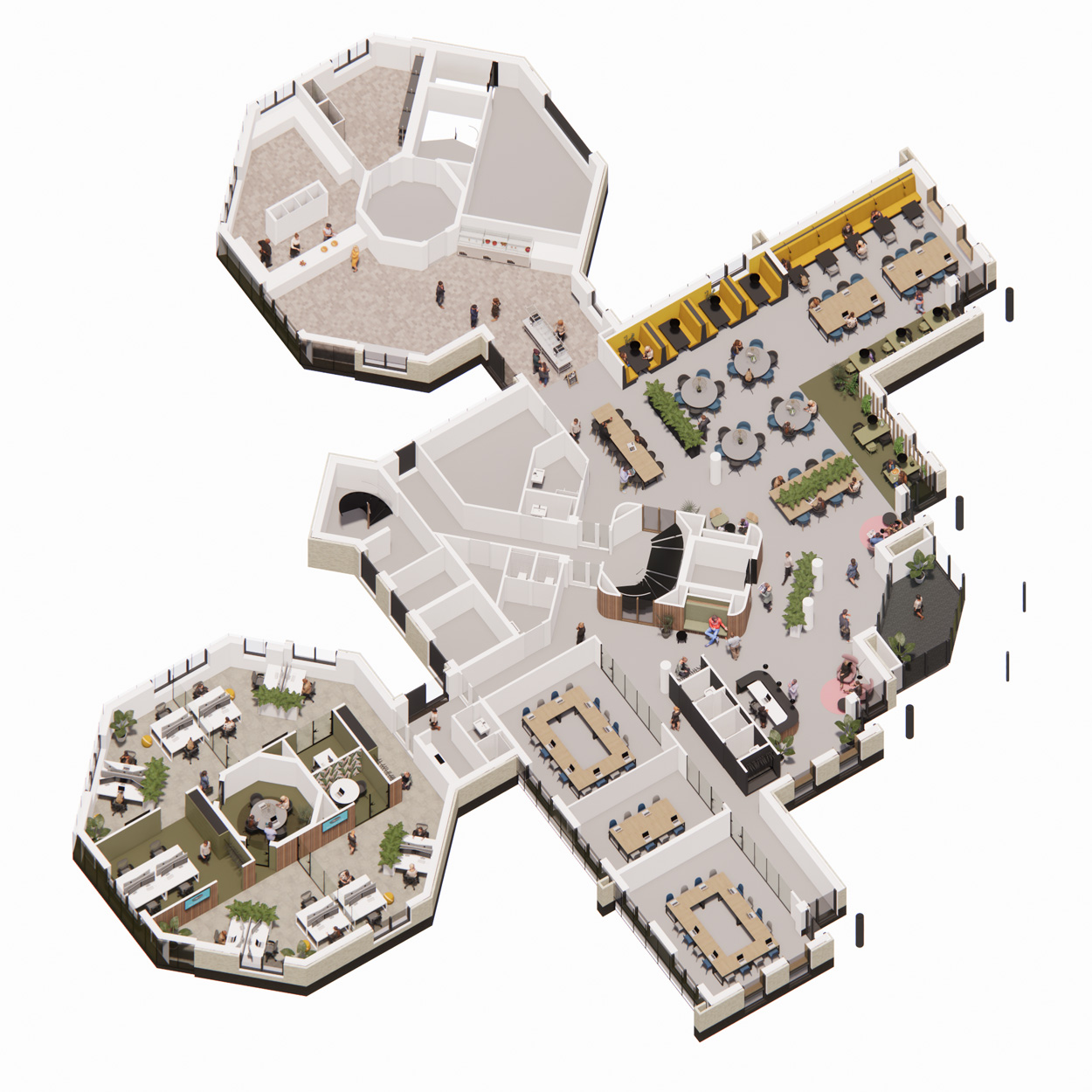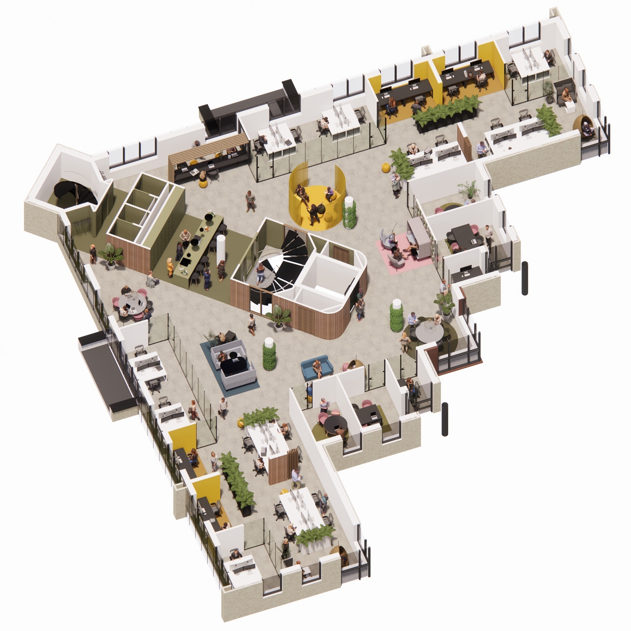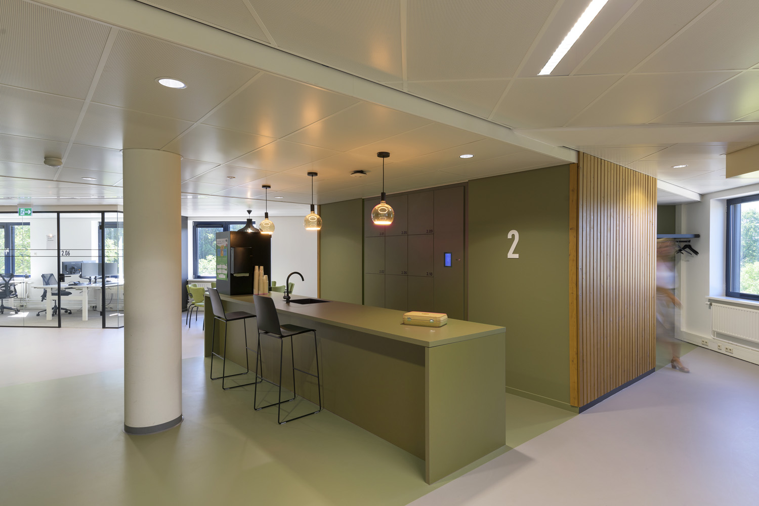 Elke verdieping heeft een centrale middenzone waarin de toiletten, koffiebar, werkkasten en de bestaande kern met trap en lift zijn opgenomen. De middenzone deelt de verdieping op in zones voor de verschillende afdelingen. Als je via de trap op de verdieping komt, sta je direct in de koffiebar die onderdeel is van de middenzone. Aan beide zijden van de kern is een doorloop naar de afdelingen. Elke afdeling heeft een variëteit aan werk- en zitplekken. De sfeer kenmerkt zich door heldere en frisse kleuren in combinatie met warme houten elementen en groene planten.