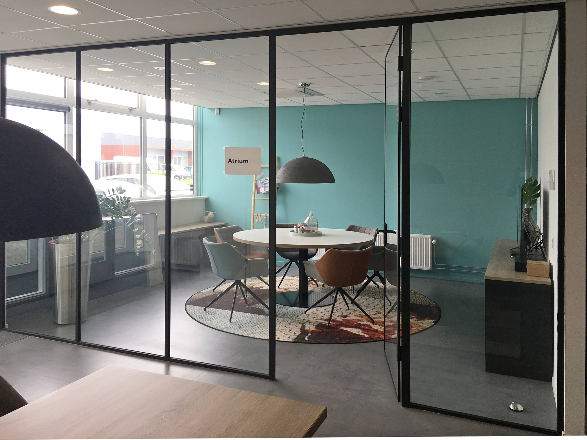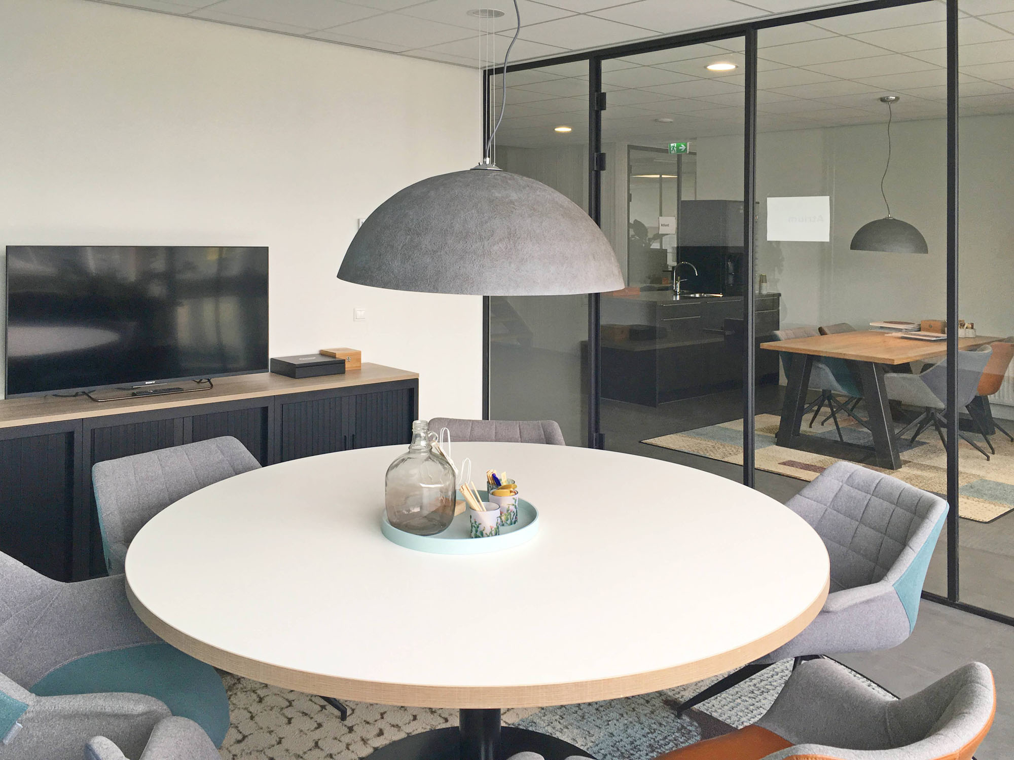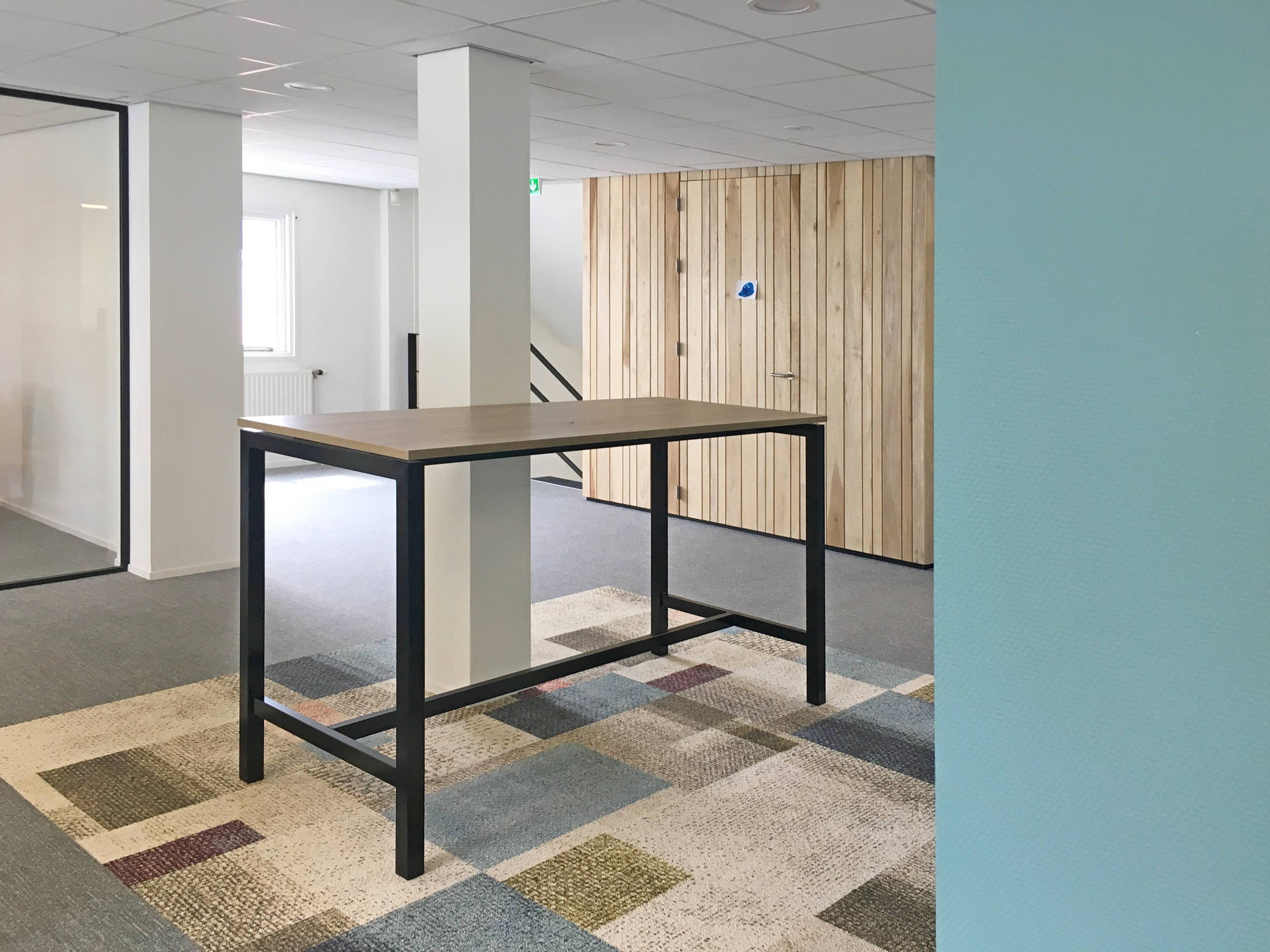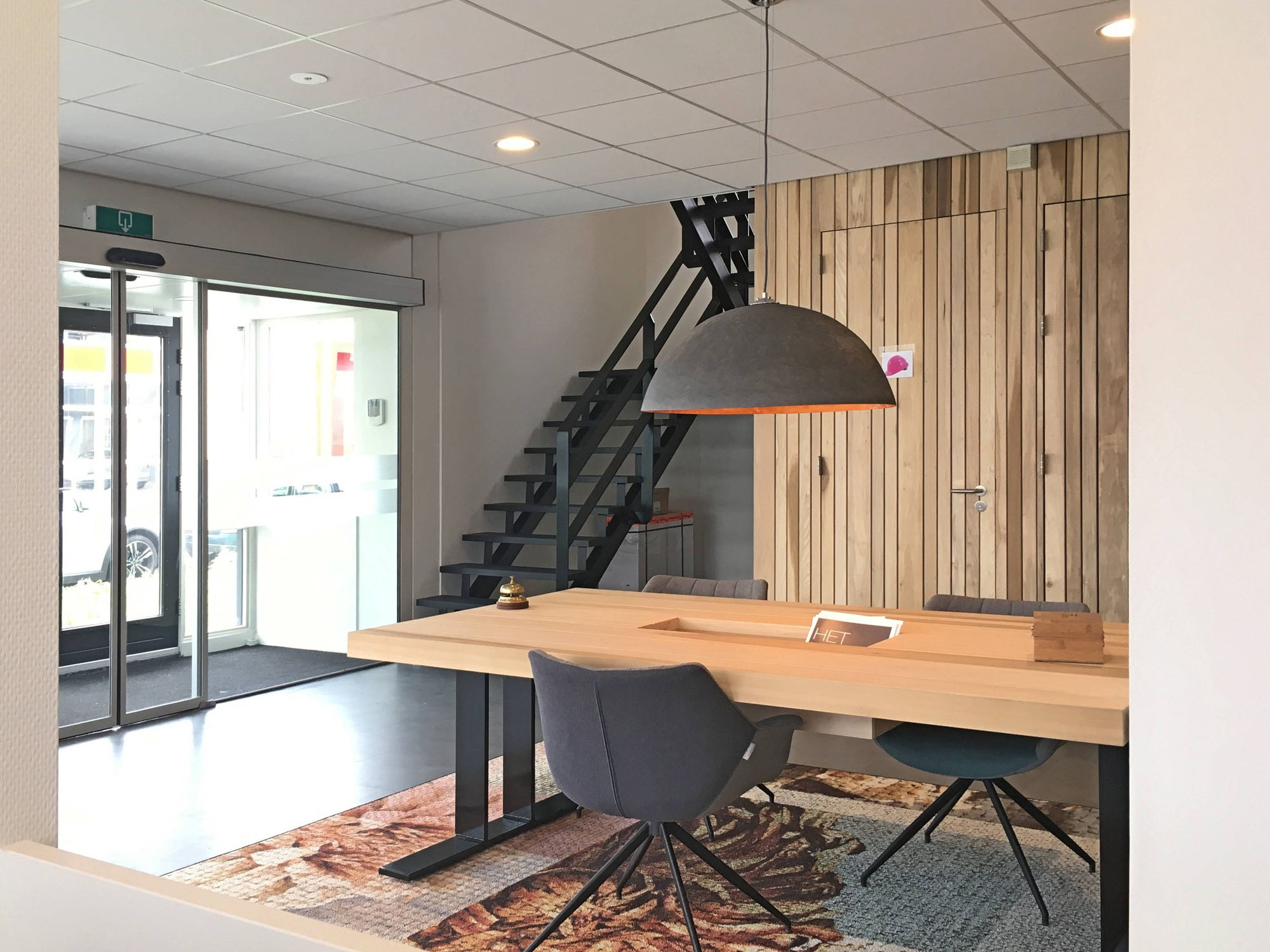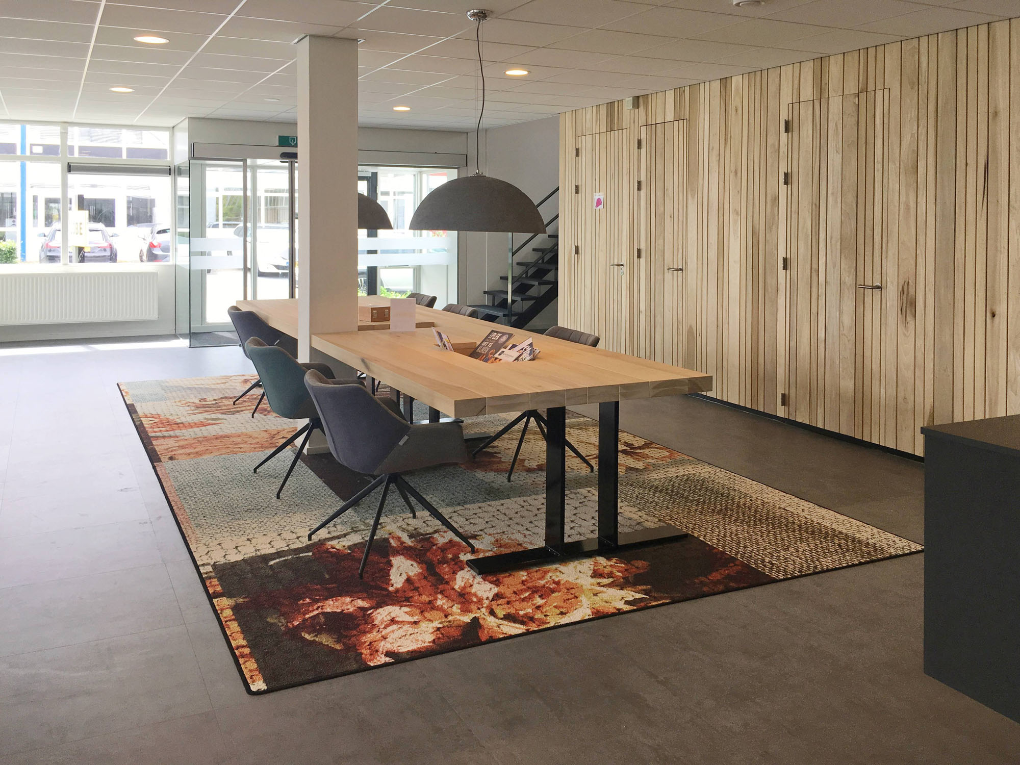 Het nieuwe interieur heeft een warme uitstraling gekregen. Het moest passen bij een bouwbedrijf. Gekozen is voor materialen als beton, staal en hout. In combinatie met vloerkleden in warme kleuren en sfeerverlichting.