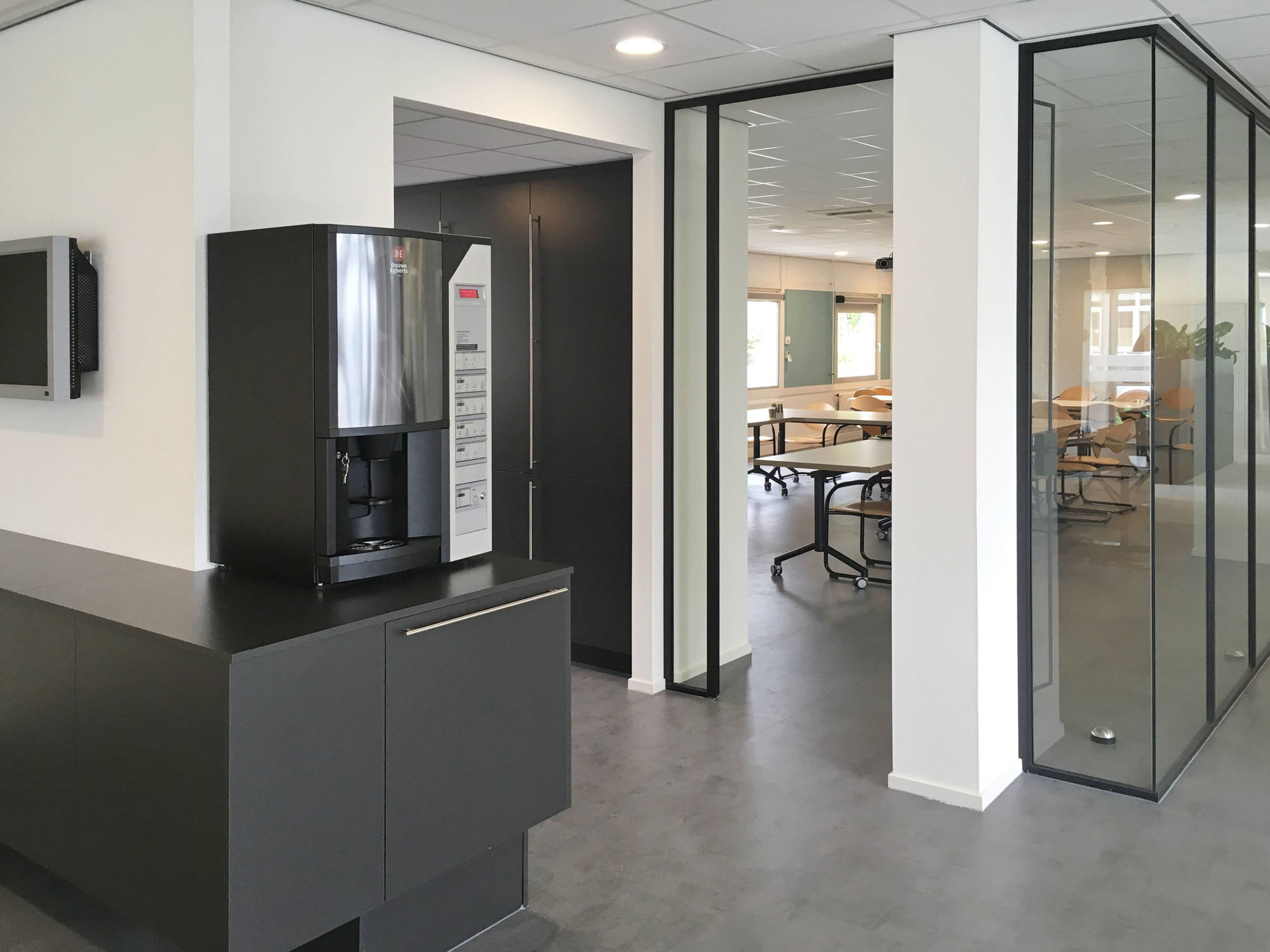 Bij binnenkomst via de voordeur sta je direct in een grote ontvangsthal met leestafel. Vanuit deze ruimte is er zicht op de vergaderkamers en kantoren die gescheiden zijn door glazenwanden. De traditionele receptie is verdwenen en is opgenomen in de kantoorzone grenzend aan de ontvangsthal.