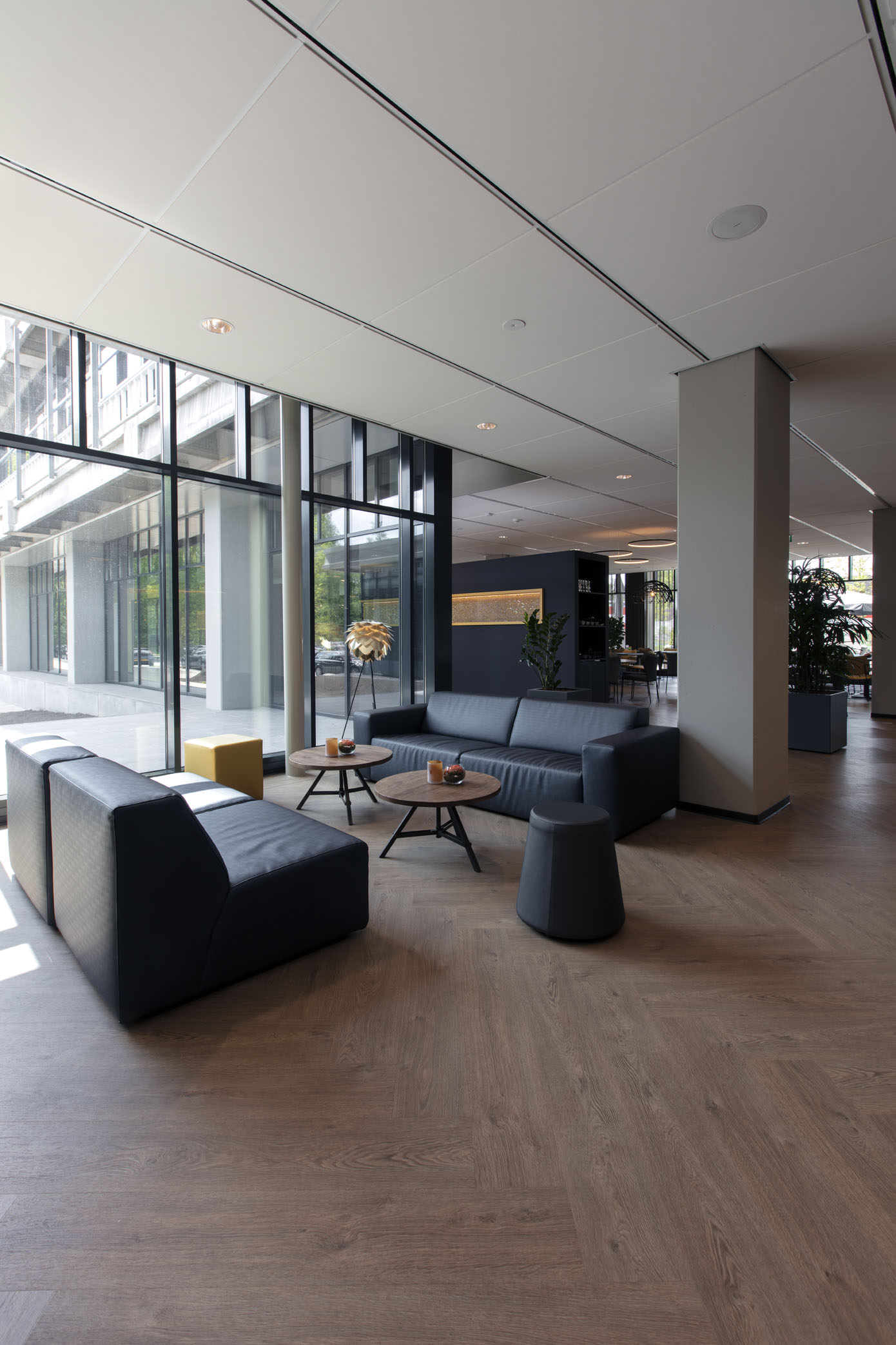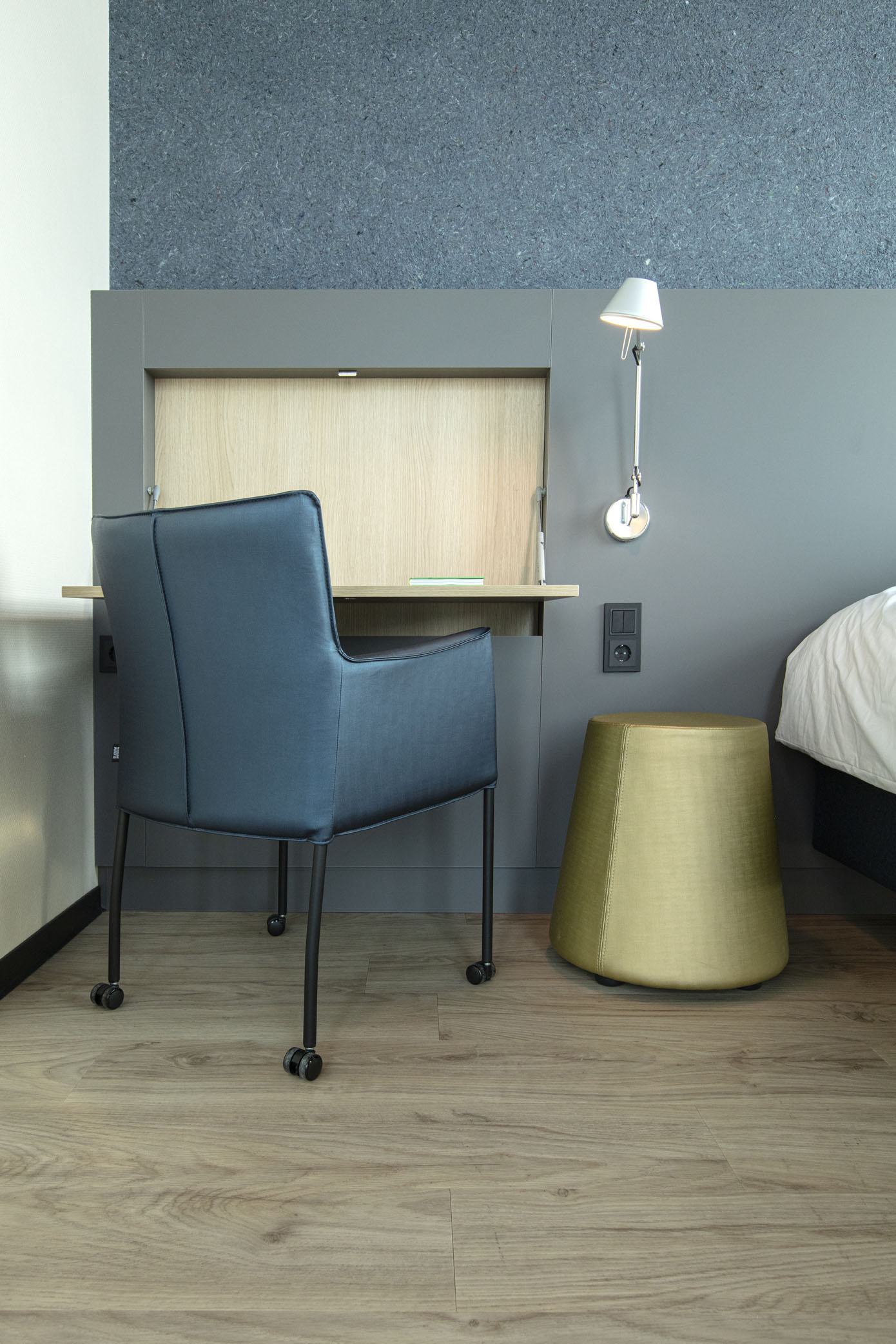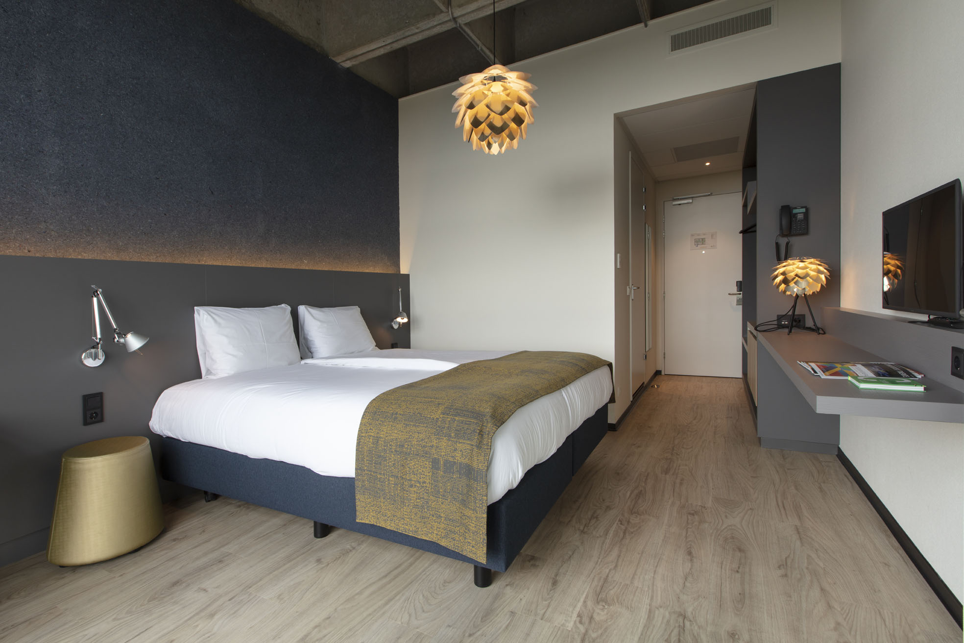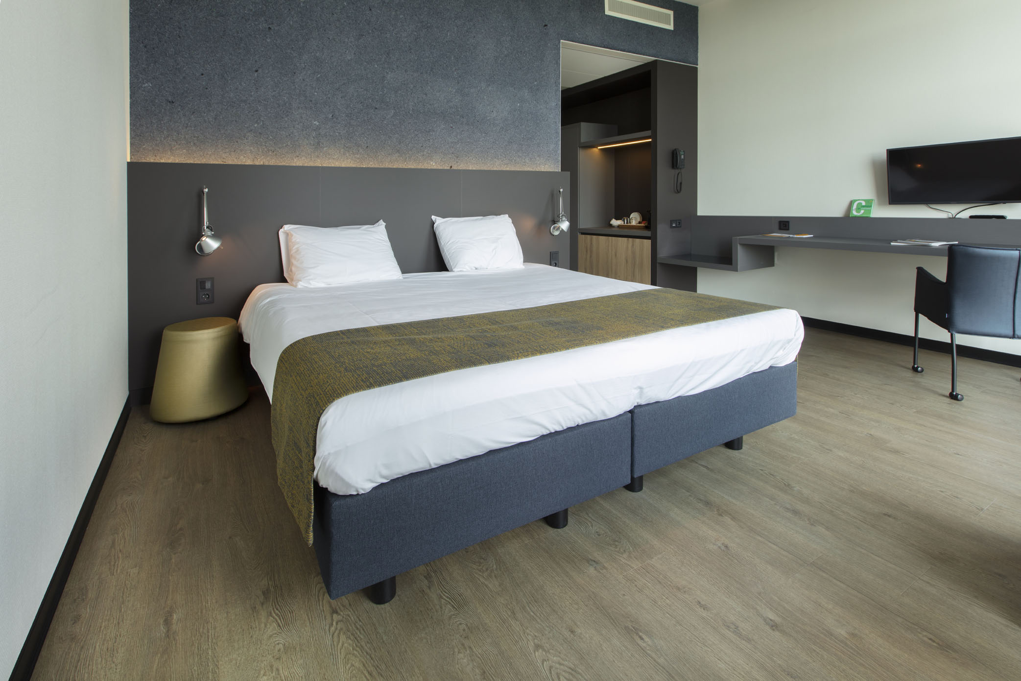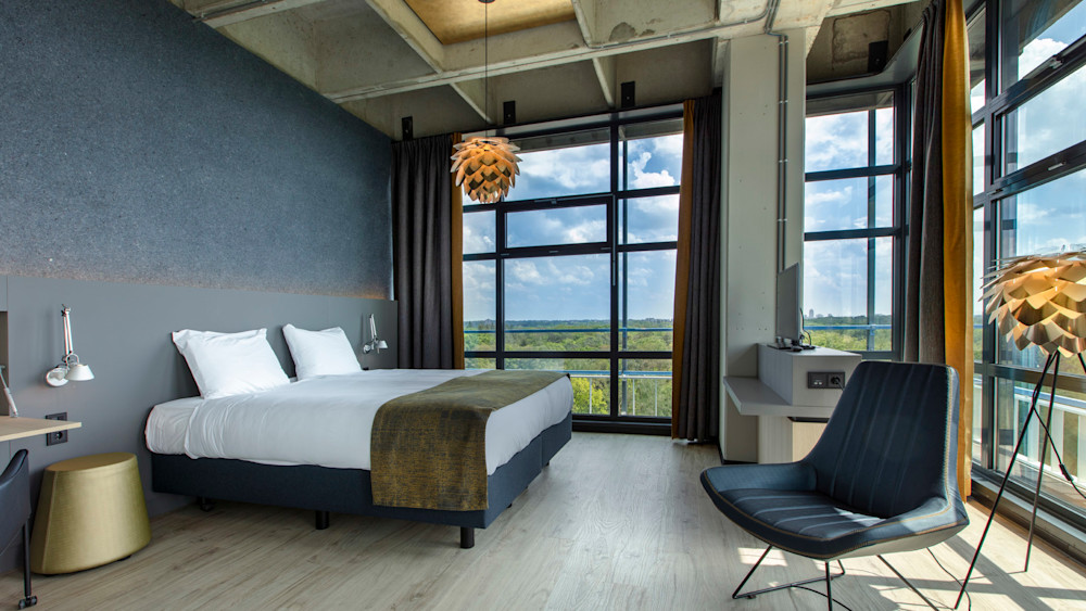 Zo mooi als een betonnen structuur is, heeft het ook zo zijn uitdagingen. Zoals voor het zorgen van een prettige akoestiek in de ruimtes. Hiervoor kozen we voor een achterwand van gemalen spijkerbroekvezel. Dit materiaal heeft niet alleen een goede akoestische werking. Het is een duurzaam materiaal dankzij het hergebruik van oude spijkerbroeken. Een innovatieve en mooie manier om een hotel te voorzien van de juiste specificaties. Het was een van de vele maatregelen om een duurzaam hotel te realiseren. Het hotel heeft in 2019 het gouden Greenkey certificaat mogen ontvangen.