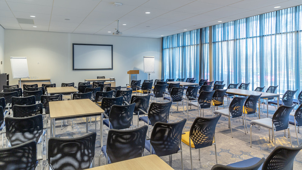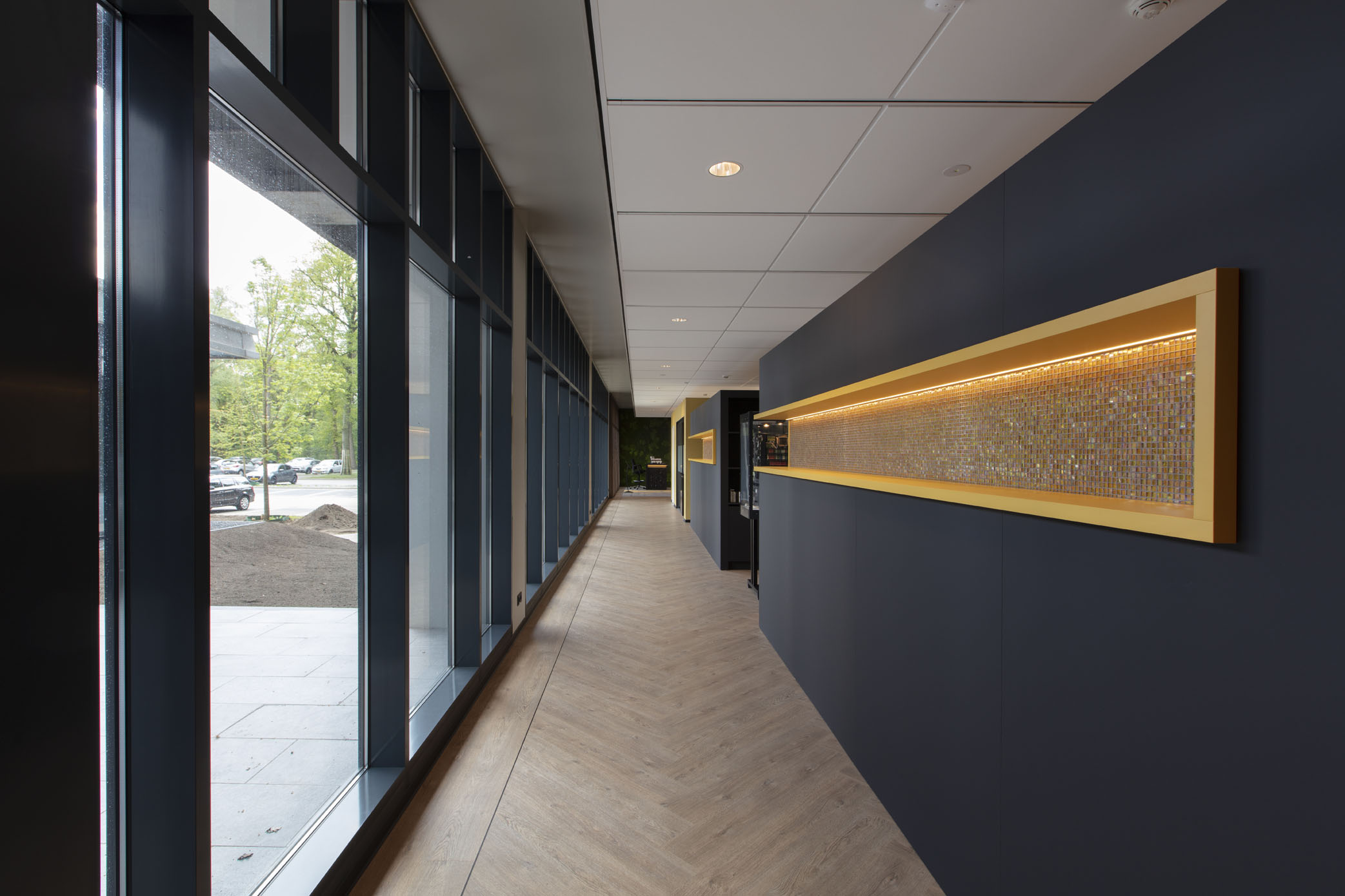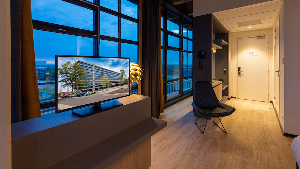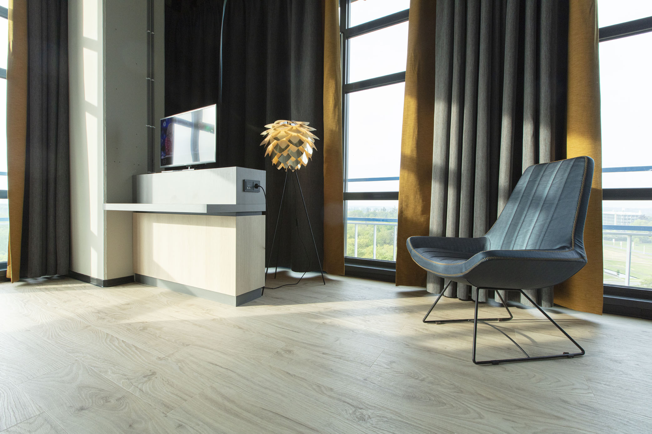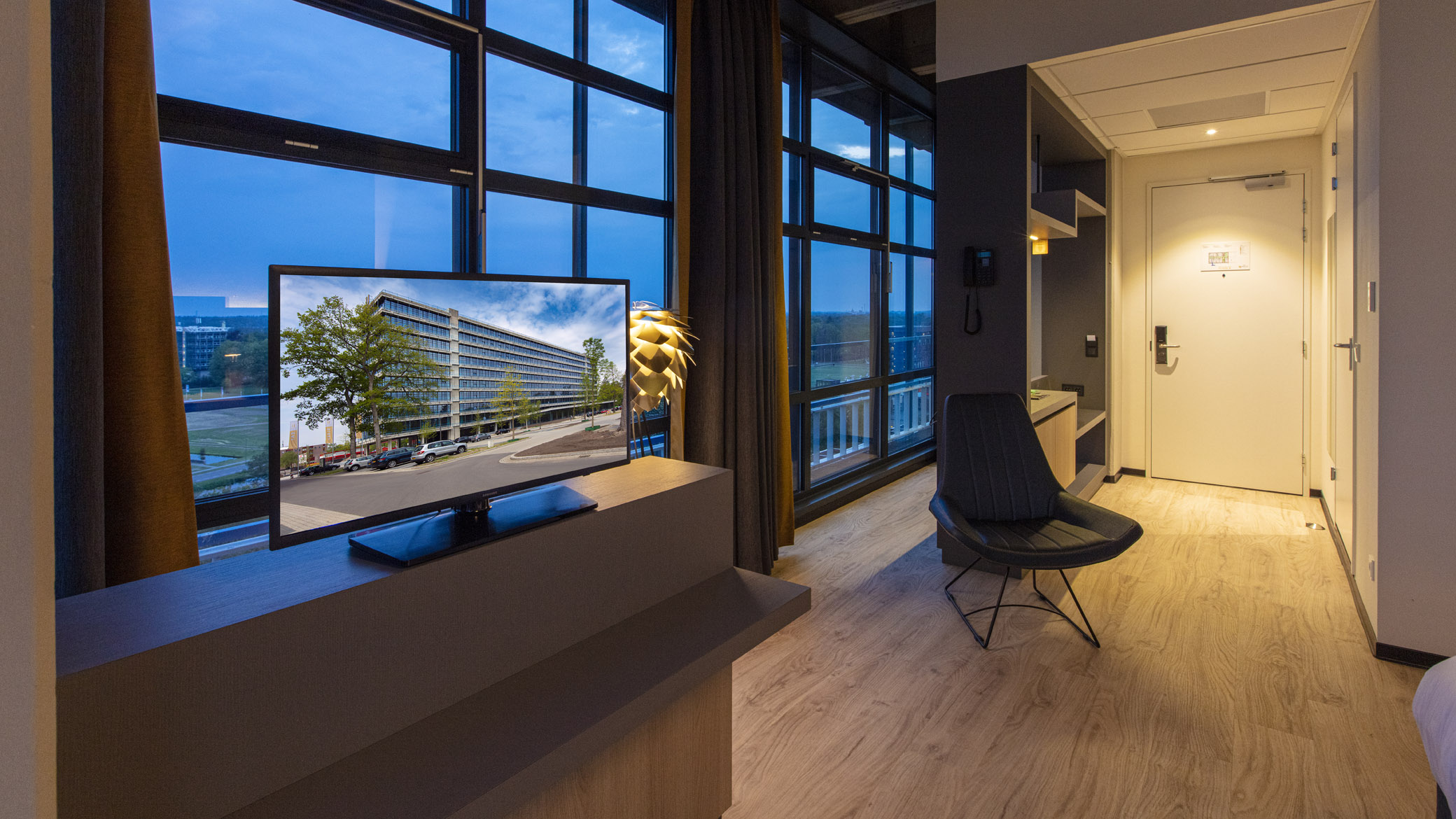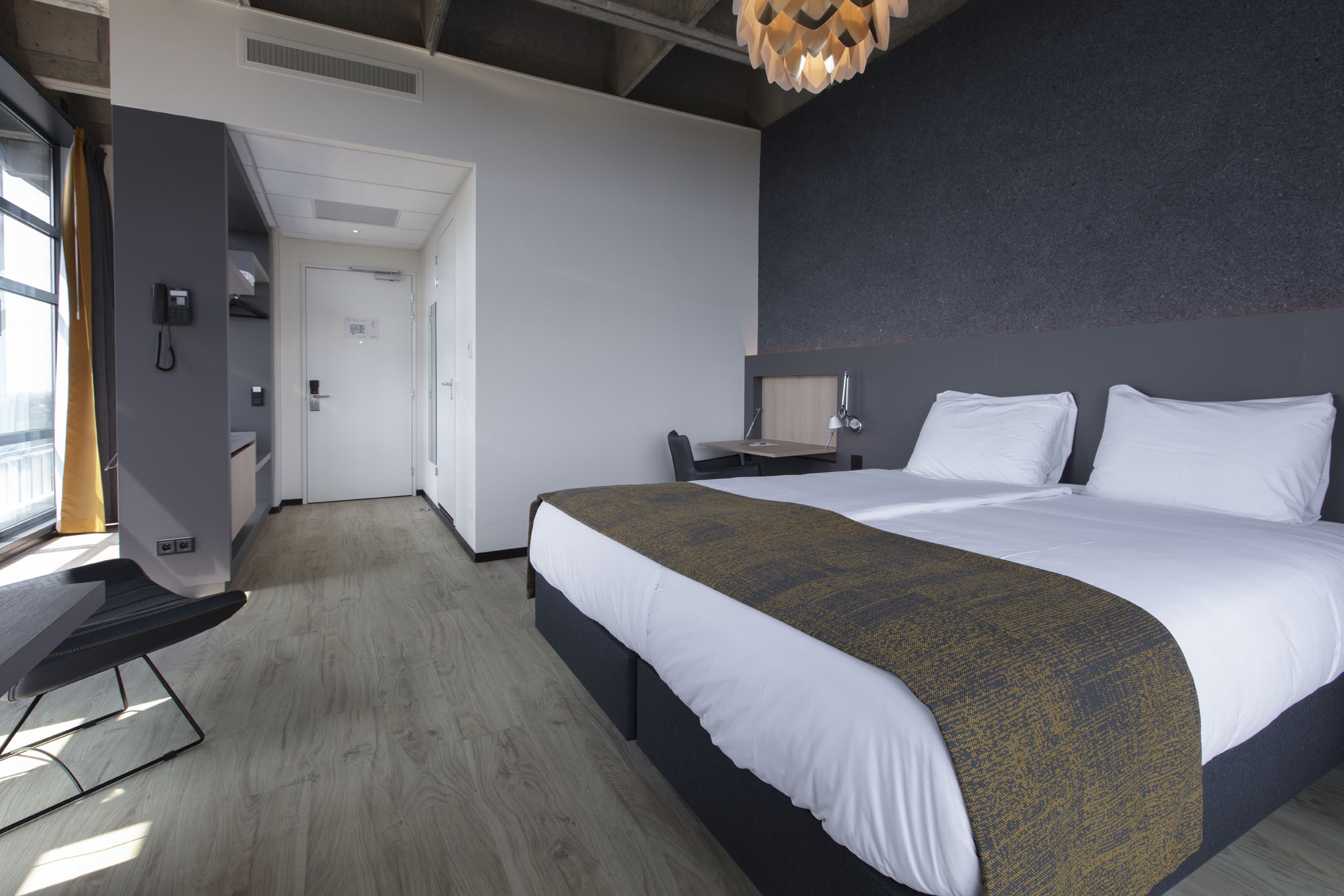 Zo mooi als een betonnen structuur is, heeft het ook zo zijn uitdagingen. Zoals voor het zorgen van een prettige akoestiek in de ruimtes. Hiervoor kozen we voor een achterwand van gemalen spijkerbroekvezel. Dit materiaal heeft niet alleen een goede akoestische werking. Het is een duurzaam materiaal dankzij het hergebruik van oude spijkerbroeken. Een innovatieve en mooie manier om een hotel te voorzien van de juiste specificaties. Het was een van de vele maatregelen om een duurzaam hotel te realiseren. Het hotel heeft in 2019 het gouden Greenkey certificaat mogen ontvangen.