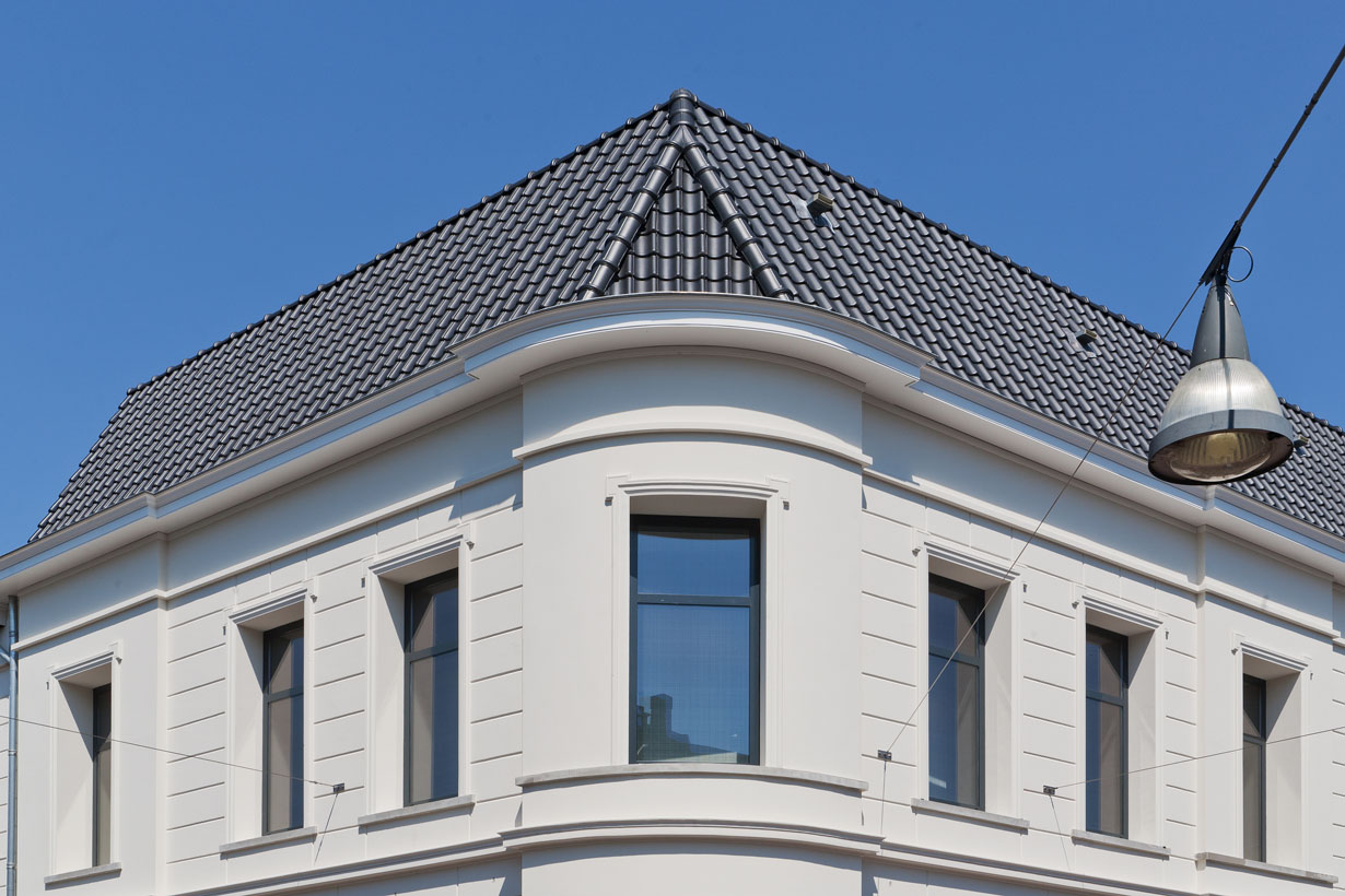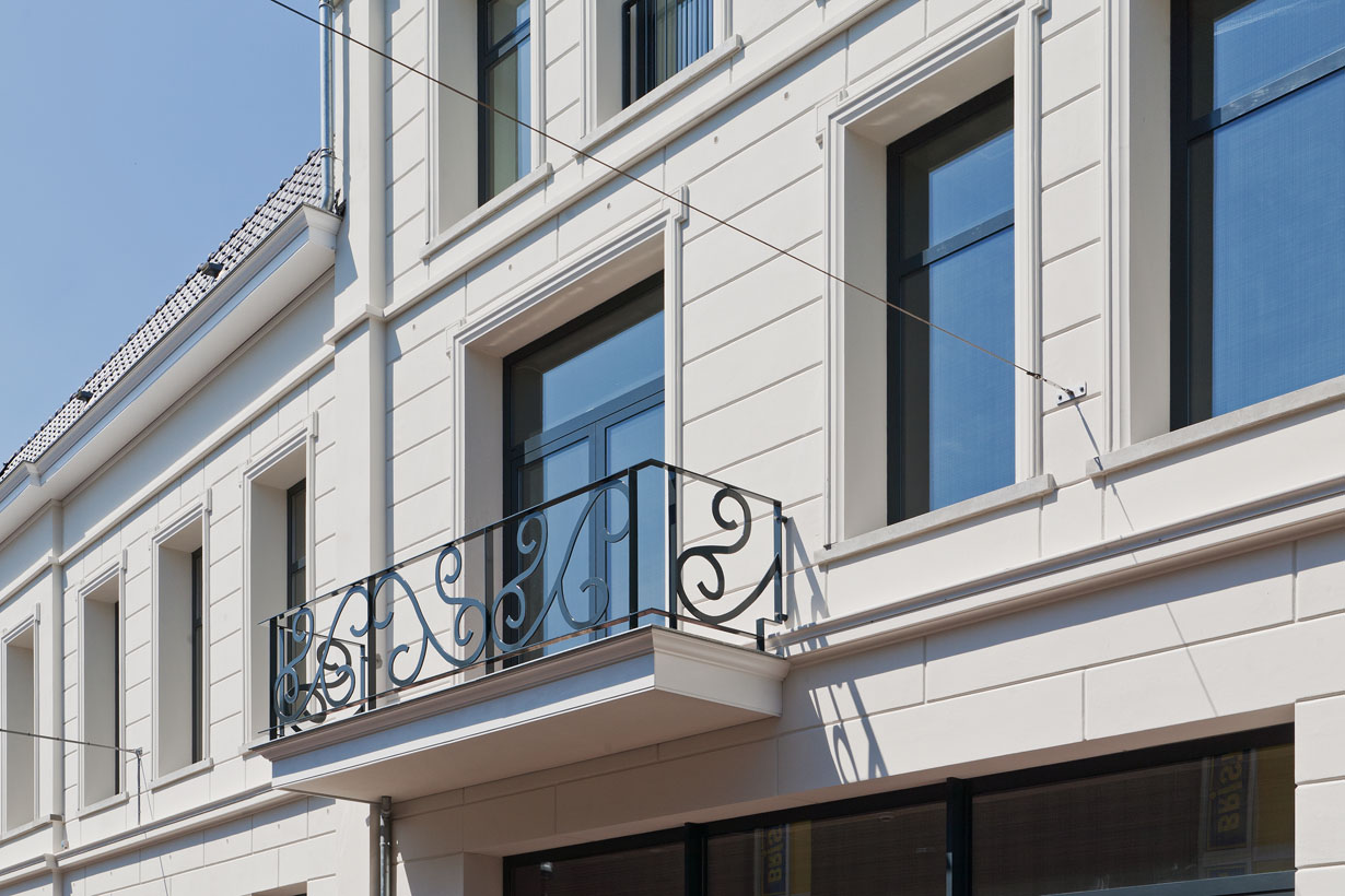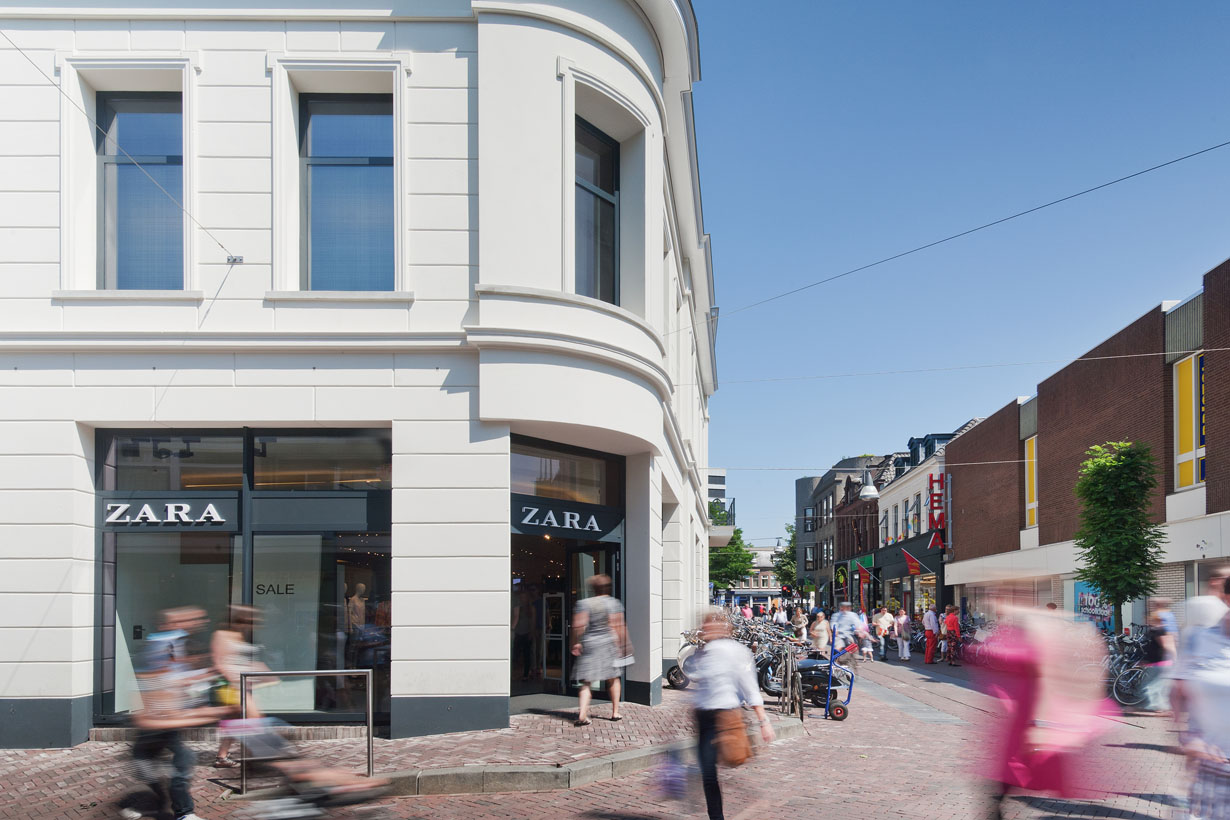 Daarom hebben we in de eerste plaats geprobeerd het gebouw weer te laten ‘landen’: het verwijderen van de horizontale bak op de gevel en de voortzetting van de penanten op de eerste verdieping tot aan het maaiveld. Door de aantallen penanten te abstraheren tot diegene die daadwerkelijk de ruimtelijke structuur van het gebouw benadrukken, hebben we tegelijkertijd genoeg openheid en etalageruimte op de begane grond gecreëerd waar een moderne winkel behoefte aan heeft.