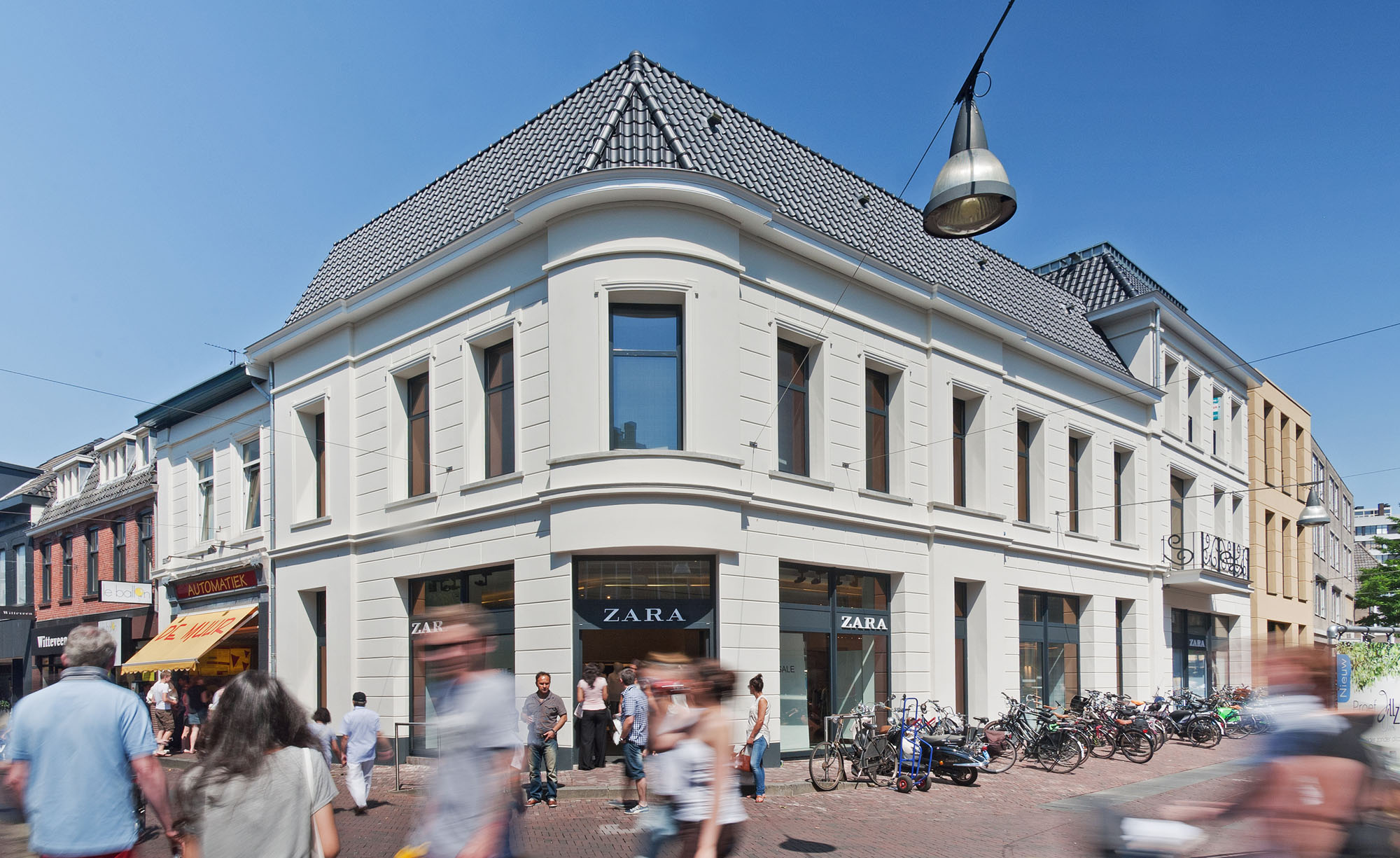 In de eerste plaats hebben wij geprobeerd het gebouw weer te laten ‘landen’; door het verwijderen van de horizontale bak op de gevel en de voortzetting van de penanten op de eerste verdieping tot aan het maaiveld. Door het aantal penanten te abstraheren tot diegene die daadwerkelijk de ruimtelijke structuur van het gebouw benadrukken, hebben we tegelijkertijd genoeg openheid en etalageruimte op de begane grond gecreëerd waar een moderne winkel behoefte aan heeft.