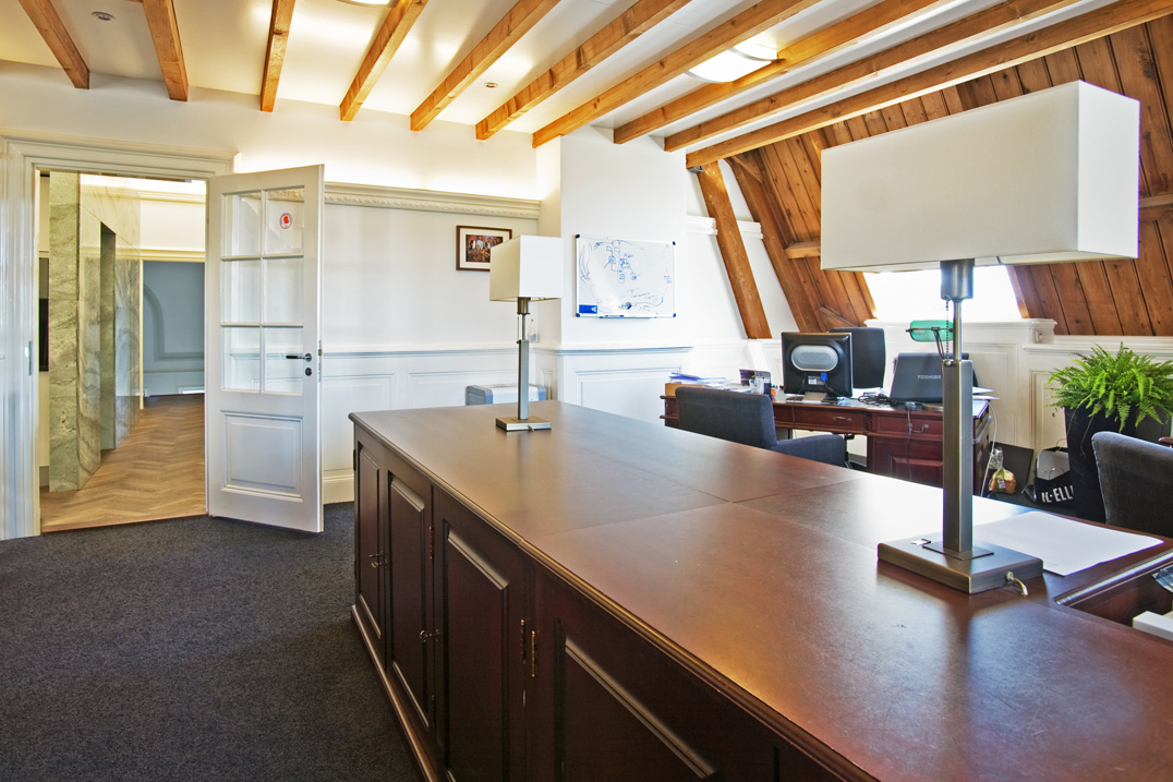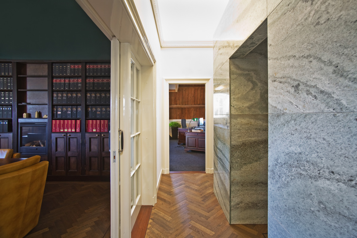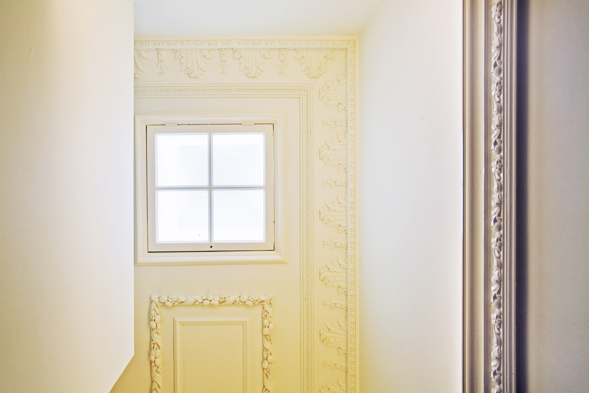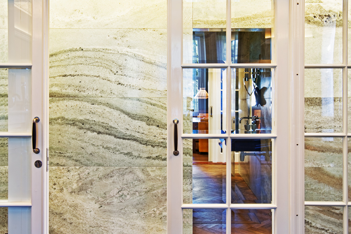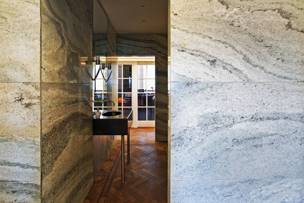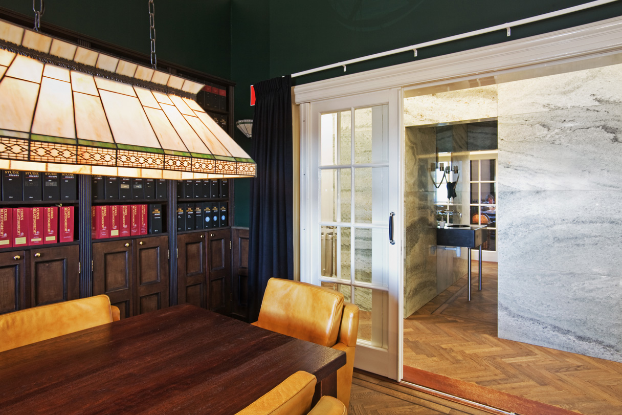 Zo hebben wij in het klassieke pand Het Witte Huis een moderne sanitaire unit in natuursteen toegevoegd. We hebben gekozen voor een strakke afwerking zonder profielen in contrast met de geprofileerde plafonds en details in het bestaande gebouw. Hiervoor hebben wij wel materiaal gekozen dat refereert aan een rijkheid die het bestaande gebouw ook uitstraalt.
