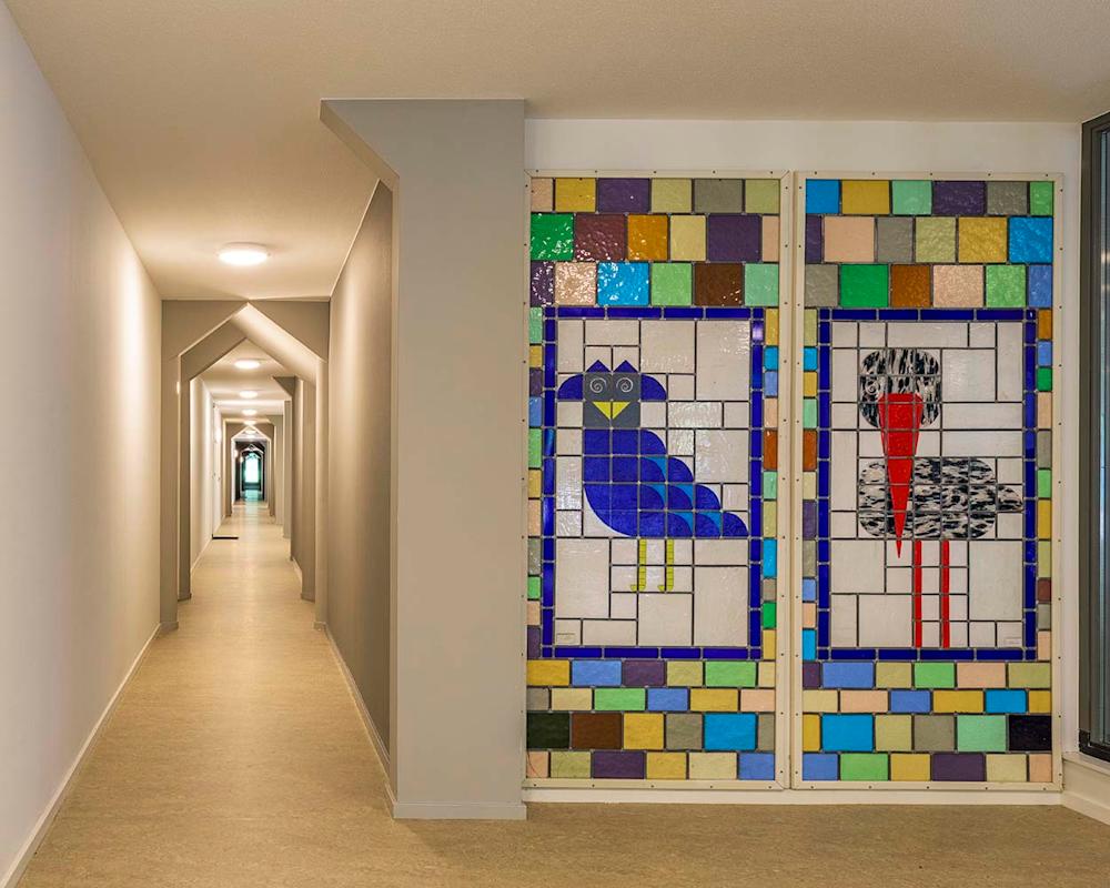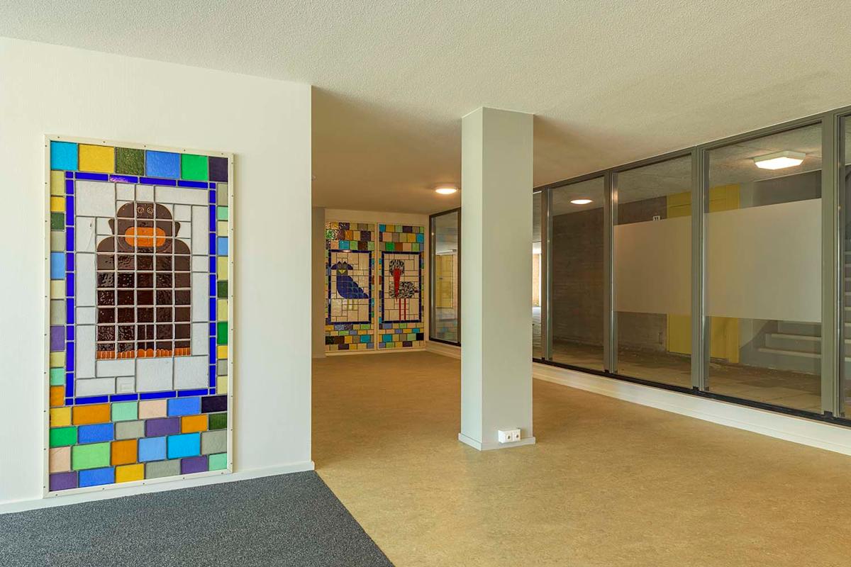 Het groot onderhoud bood tevens de gelegenheid om terug te keren naar de rust en helderheid van het originele ontwerp. De overvloed aan geel is verdwenen en teruggekeerd op de plekken waar het hoort, namelijk in de verticaliteit van de kozijnen. Nu deze kozijnen weer van hout zijn gemaakt, hebben zowel de kozijnen als de panelen daartussen allemaal dezelfde gele tint gekregen.