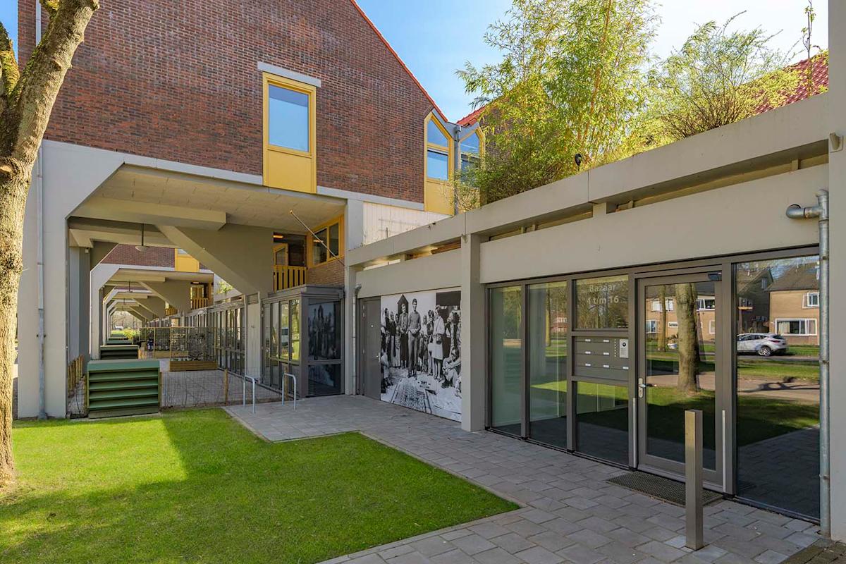 De zeven nieuwe woningen zijn bereikbaar via een binnengang. Deze centrale entree met ruimte voor scootmobielen bevindt zich tussen de bestaande Kasbar en de zeven woningen. De transparante entree geeft vanaf de straat doorzicht naar de Bazaar. De nieuwe voorgevel van de woningen steekt iets verder uit dan de bestaande gevel, om zo voldoende ruimte en daglicht te creëren. De nieuwe gevel is volledig gemaakt van hout, gevuld met glas. De puien krijgen dezelfde donkergrijze kleur als de later toegevoegde elementen. Dankzij de subtiele kleuren en luchtige uitstraling behoudt het krachtige beeld van de opgetilde woning op betonnen pilaren zijn karakter.