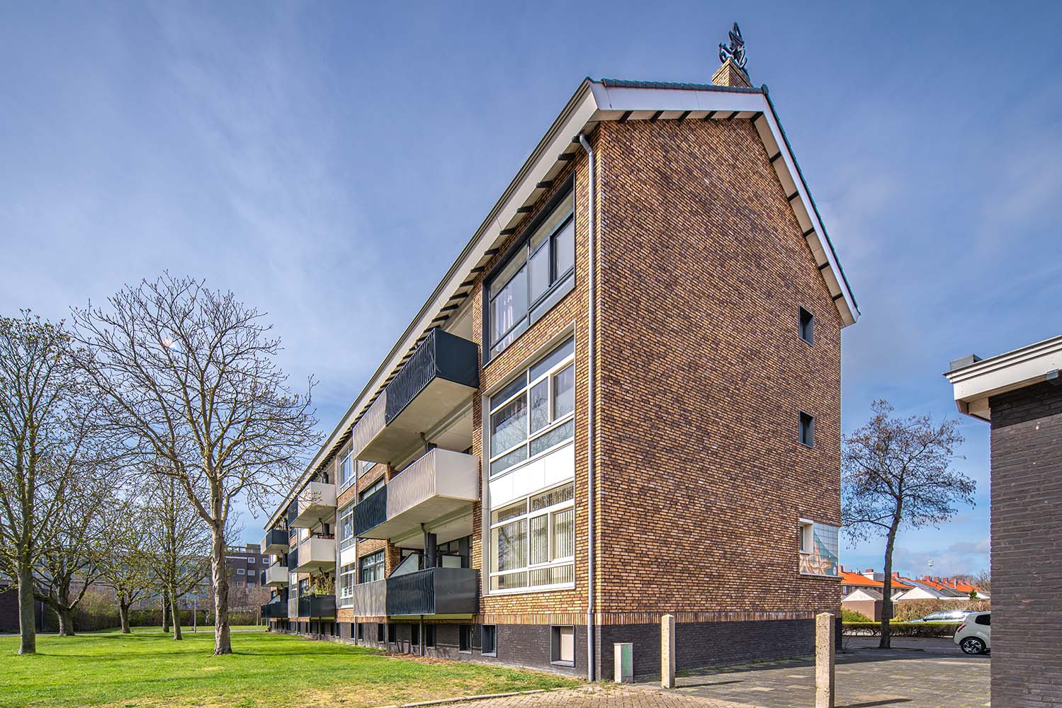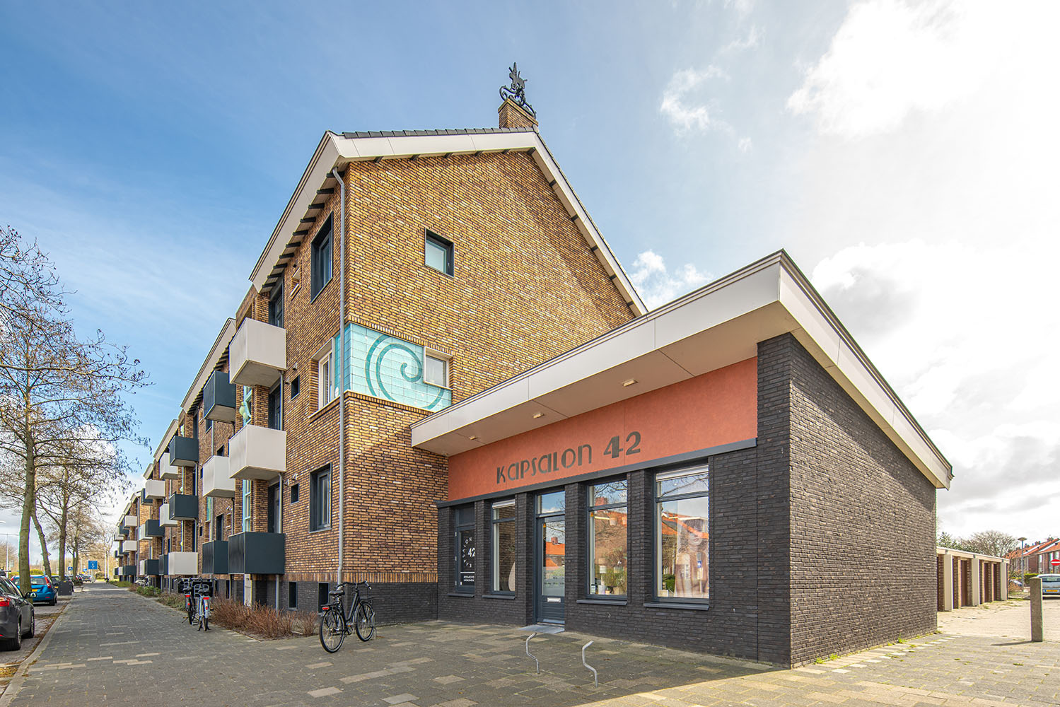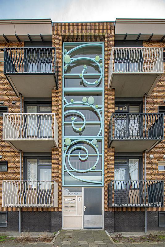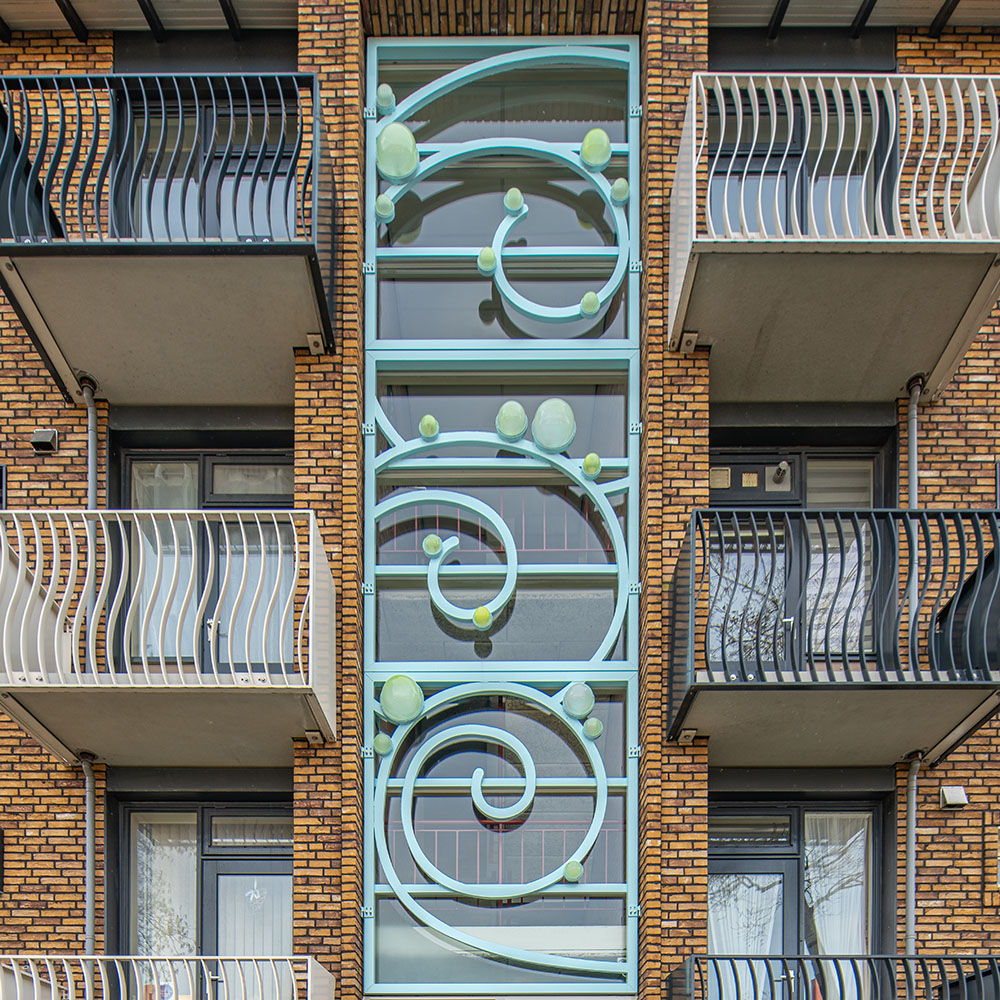 De combinatie van de strakke orthogonale vlakken met het frivole vrije kunstwerk maken dit project tóch nog tot een opzienbarend project dat het aanzicht van de straat aanzienlijk heeft verfraaid!