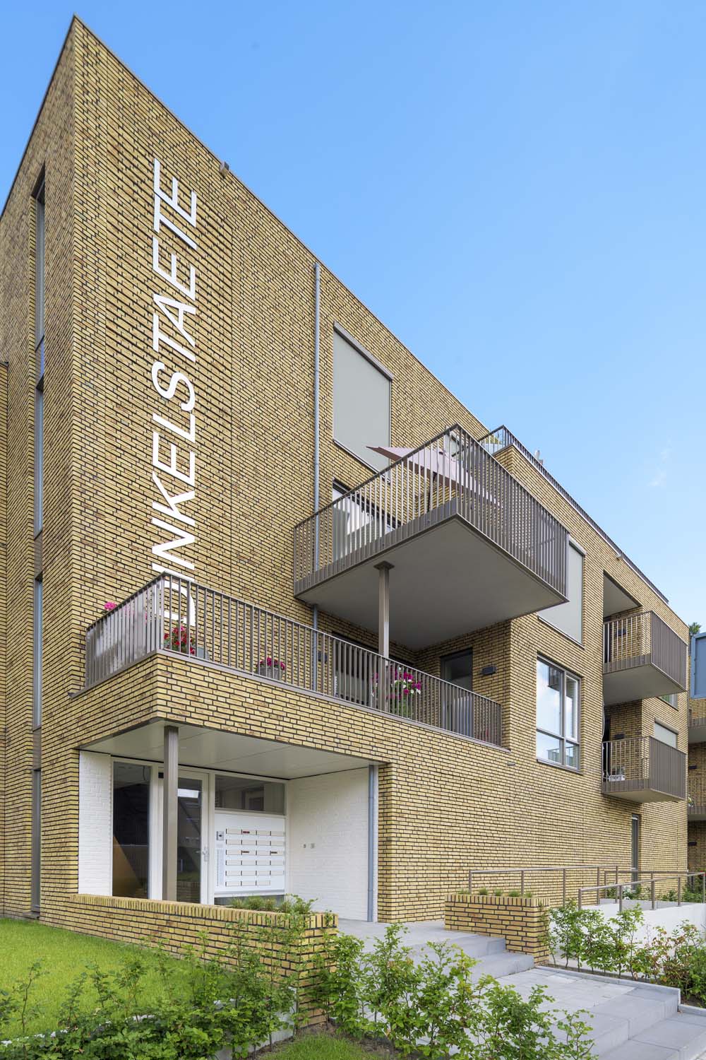 Het gebouw is vormgegeven als één herkenbare massa, met verschillende hoogtes en terugliggende gevels in aansluiting op de stedenbouwkundige context. Het geheel heeft een terughoudende kleurstelling van aardetinten, met natuurlijke kleuren als licht gemêleerd metselwerk, bruine-grijze kozijnen en frisse witaccenten. Subtiele metselwerkaccenten van uitgemetselde lagen verbinden de diverse raampartijen en dragen bij aan een verfijnde dieptewerking van de massa. Passend bij het dorpse karakter is een ensemble ontworpen met een prettige maat en schaal. Dit komt tot uiting in de terugliggende bovenste woonlaag, verschilllende bouwhoogtes en uitgebouwde appartementen met royale, grotendeels half overdekte balkons. Kenmerkend is de verfijnde detaillering van de aansluiting met de ranke stripstalen balustrades op de balkonranden. De stijlvolle bouw, een warme steensoort en gezamenlijke tuin rondom het gebouw geven Dinkelstaete allure.