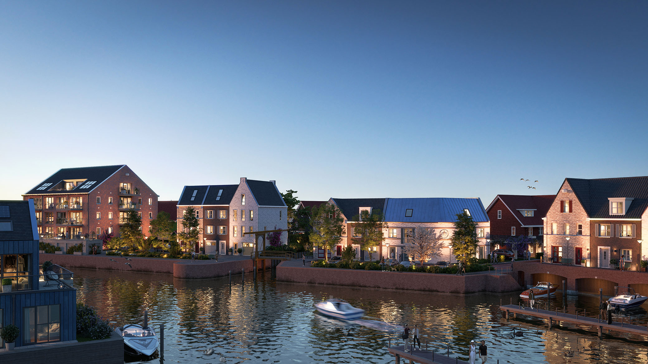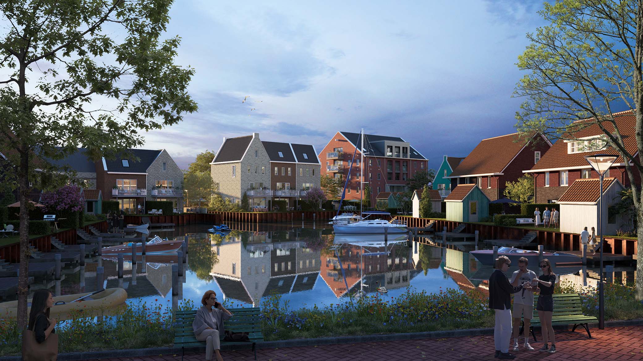 Groene straten leiden naar de haven en smalle steegjes bieden verrassende doorkijkjes richting het water. Het statige appartementengebouw vormt de blikvanger van de haven en de openbare ruimte vormt een harmonieus geheel.