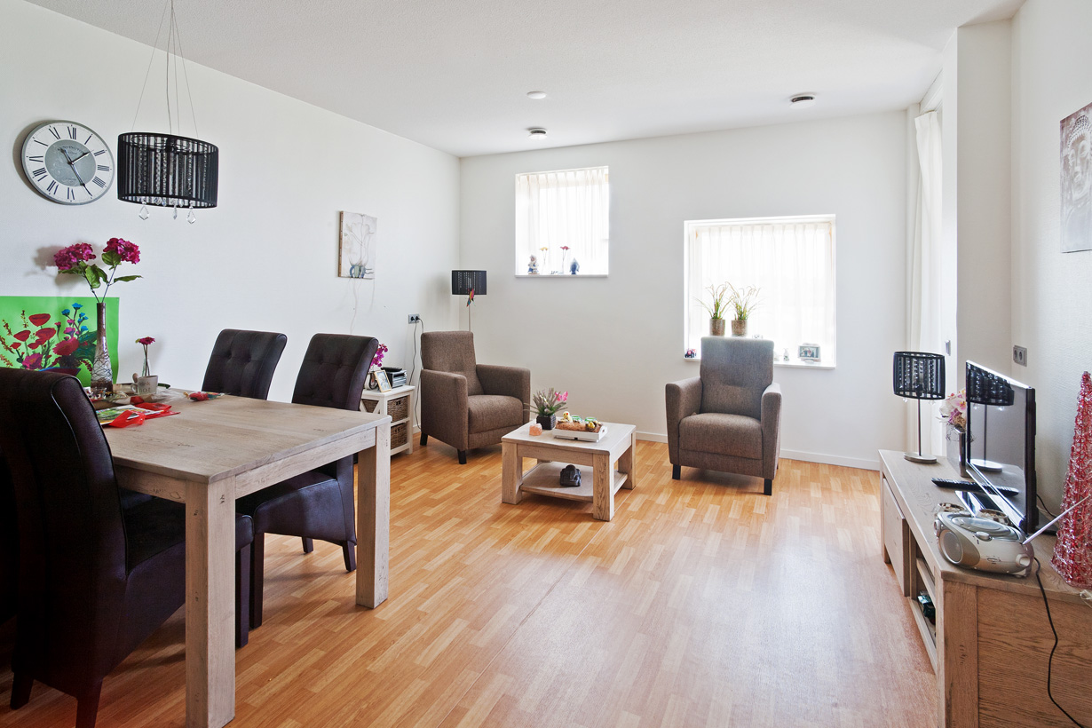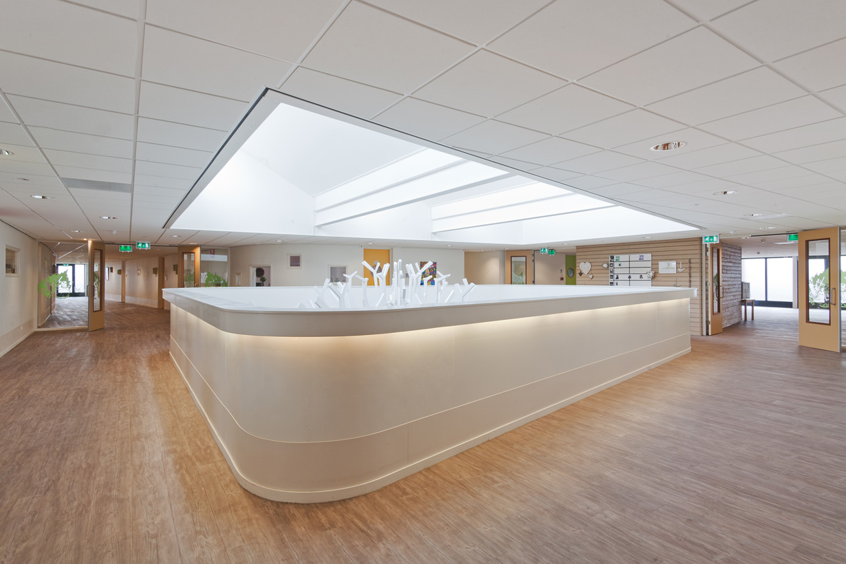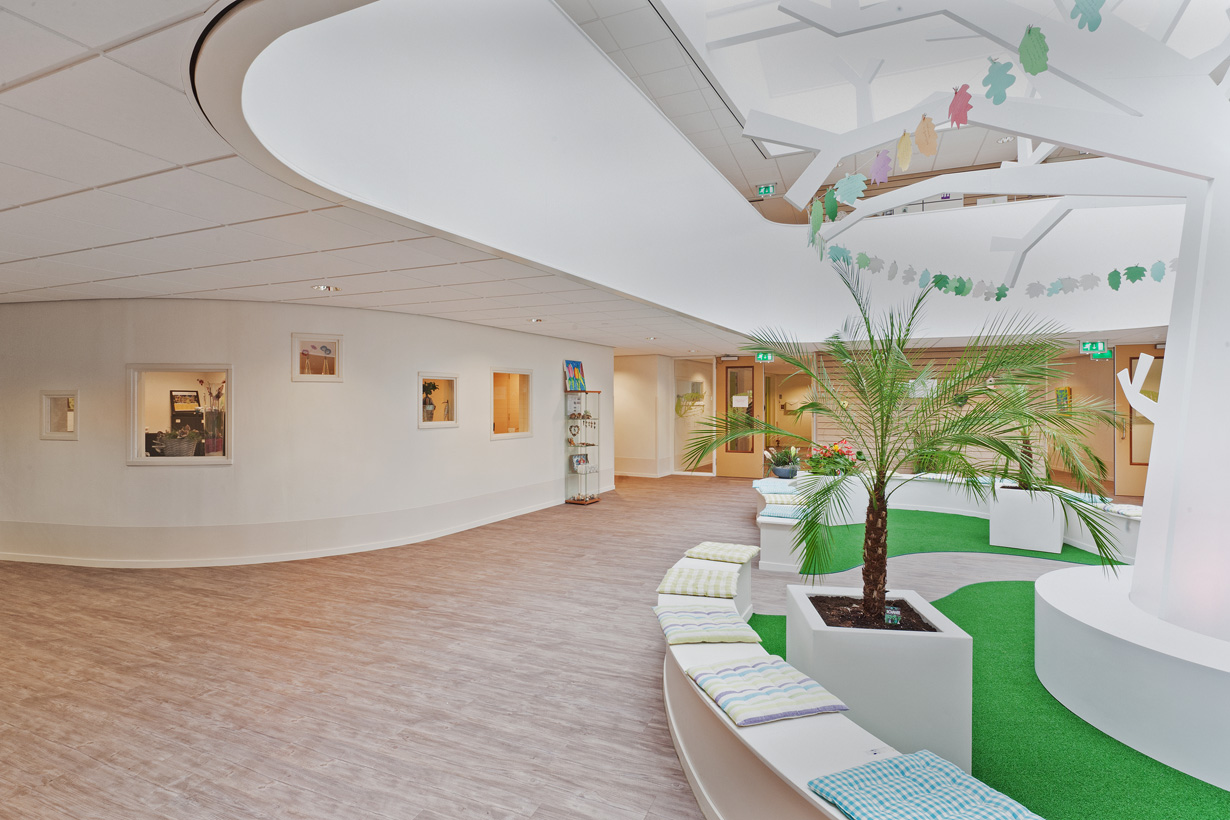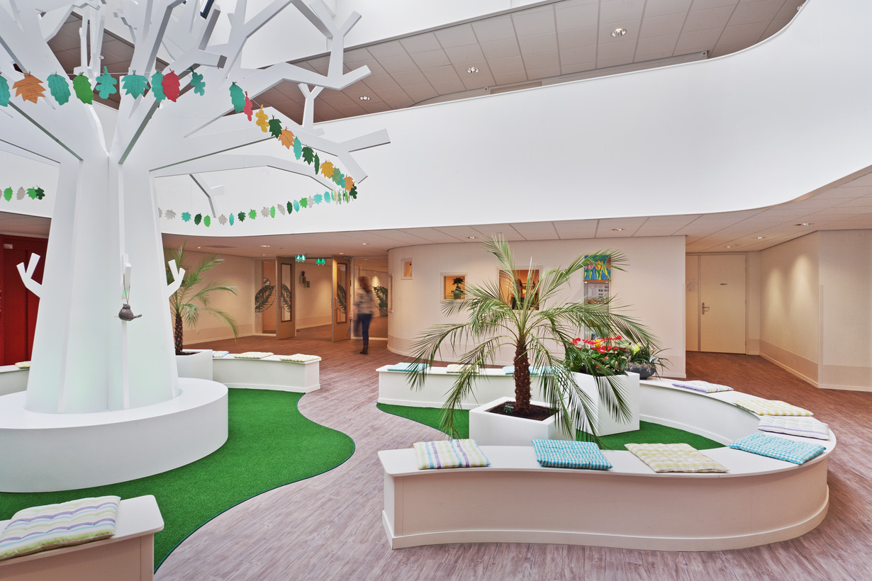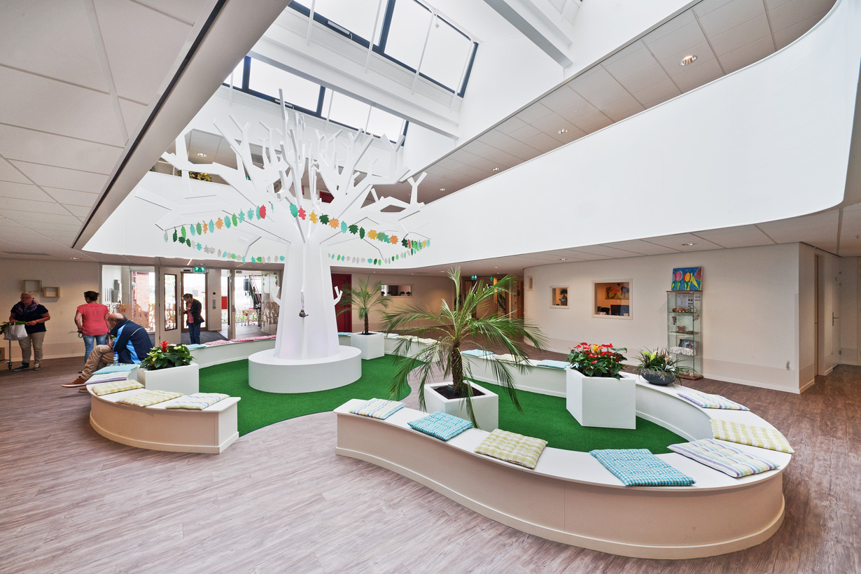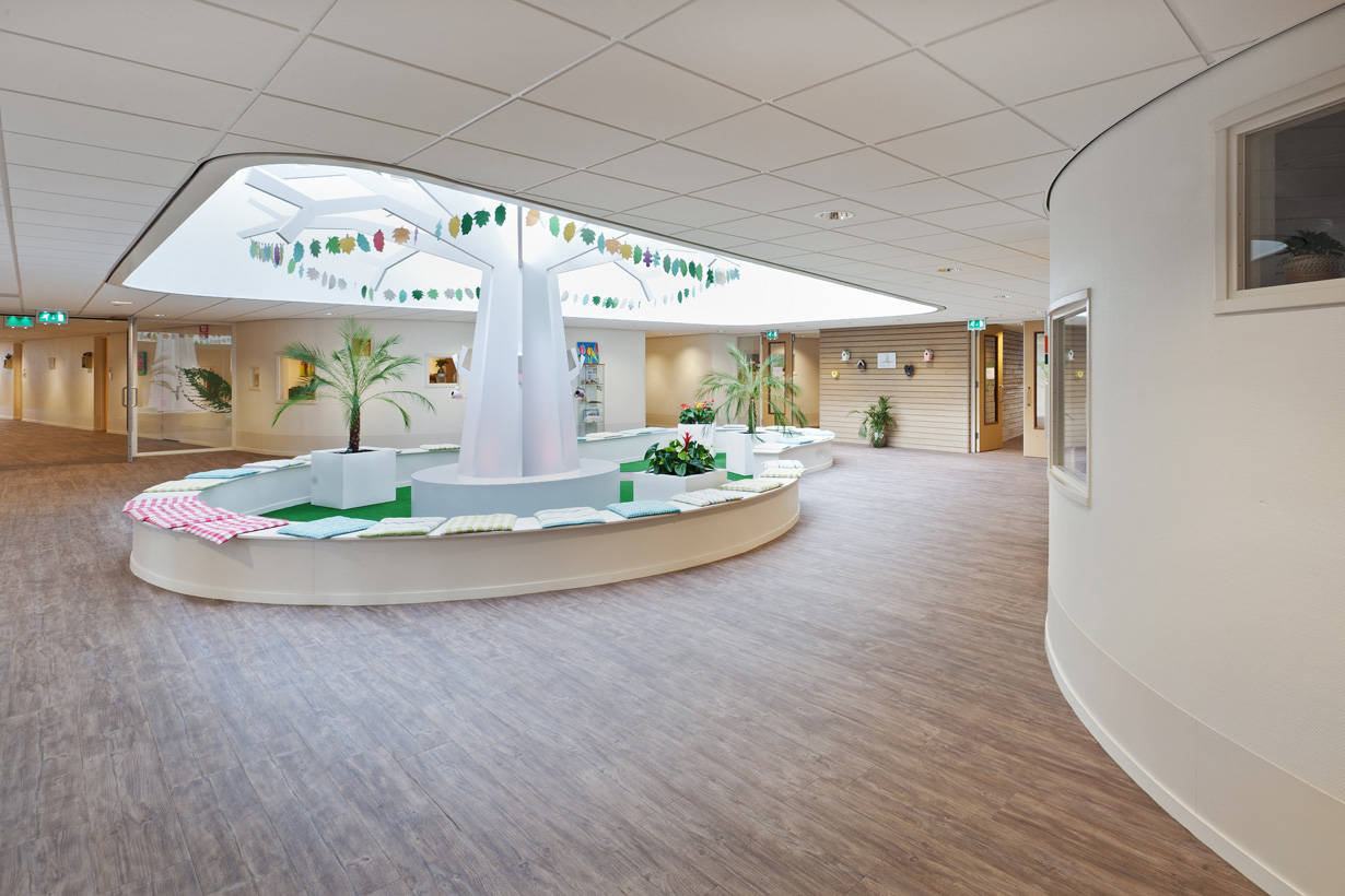 De openheid van het gebouw daagt de cliënten uit om uit hun appartement of zit/slaapkamer te komen, rond te kijken en te “ontmoeten”. De boom in de hal is hier een belangrijk onderdeel van. Het verbindt letterlijk de diverse groepen in het gebouw door de stam en zijn takken.