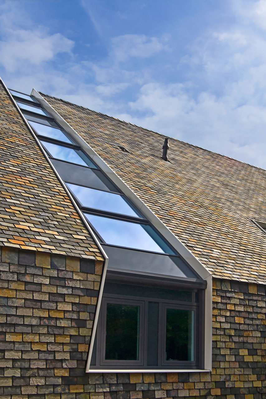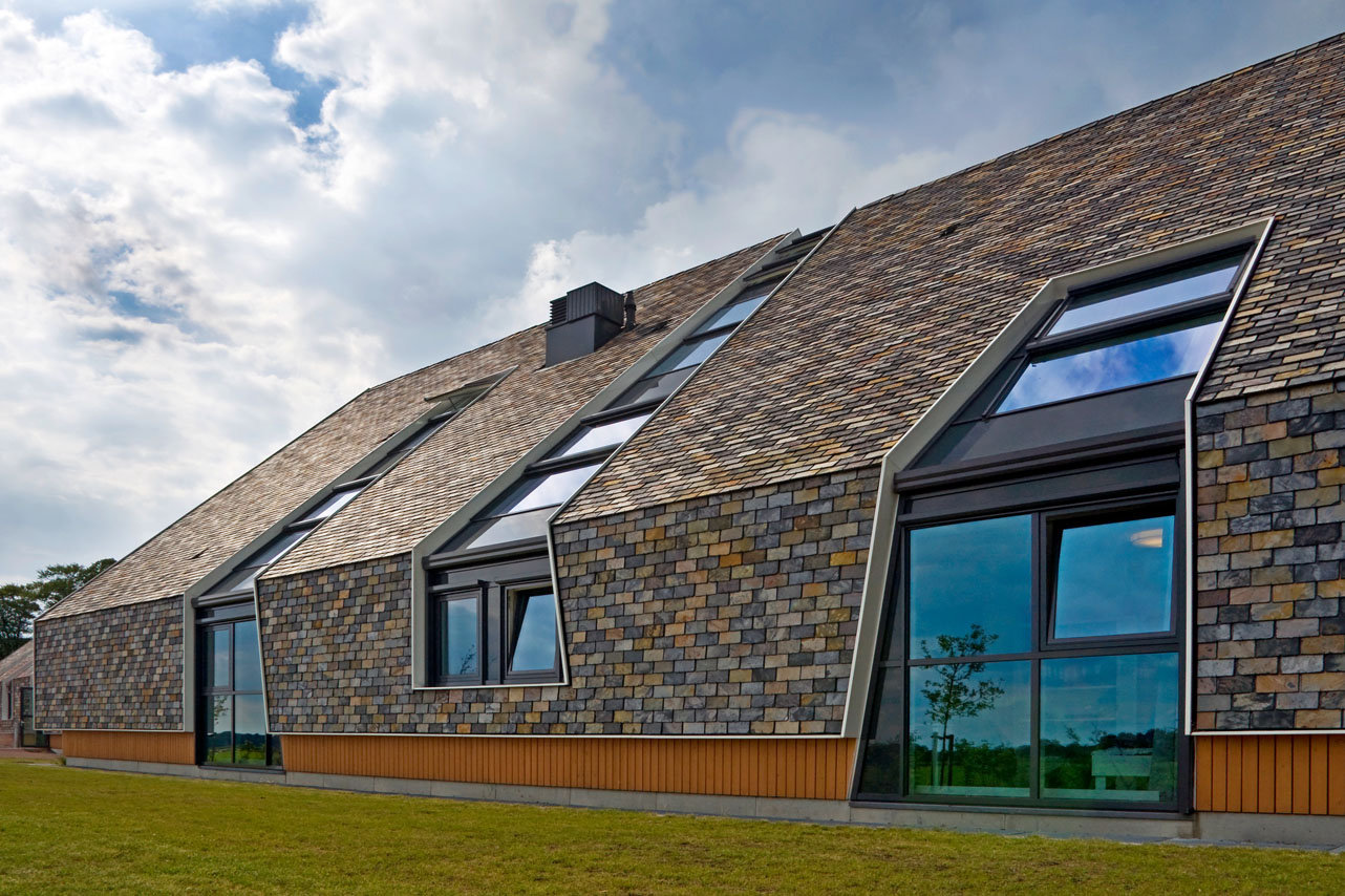 De onderbouw en de kopgevels bestaan uit een moderne invulling van hout en glas. Samen met het grote dak van gemêleerde natuurleisteen krijgt het geheel een natuurlijke uitstraling en voegt het zich op een natuurlijke wijze naar zijn omgeving.