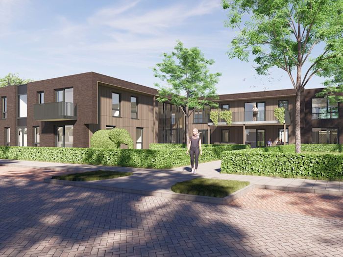 Net als de gebouwen in de buurt kent dit gebouw een metselwerk uitstraling. En net als de andere panden in de straat is dat metselwerk in aardetinten (rood- bruin). Vanuit Aveleijn was het wel gewenst dat beide functies, wonen en dagbesteding, hun eigen identiteit hebben en behouden. Dit hebben we bereikt door beide delen net in een andere tint uit te voeren. Dit zorgt tegelijkertijd voor eenheid maar voorkomt dat het beeld ontstaat van één grote instelling. Een derde materiaal, hout, verbindt beide delen weer en zorgt voor eenheid. Het is ditzelfde materiaal dat zorgt voor de overgang tussen baksteen en de buurt aan de ene kant en het park aan de andere.